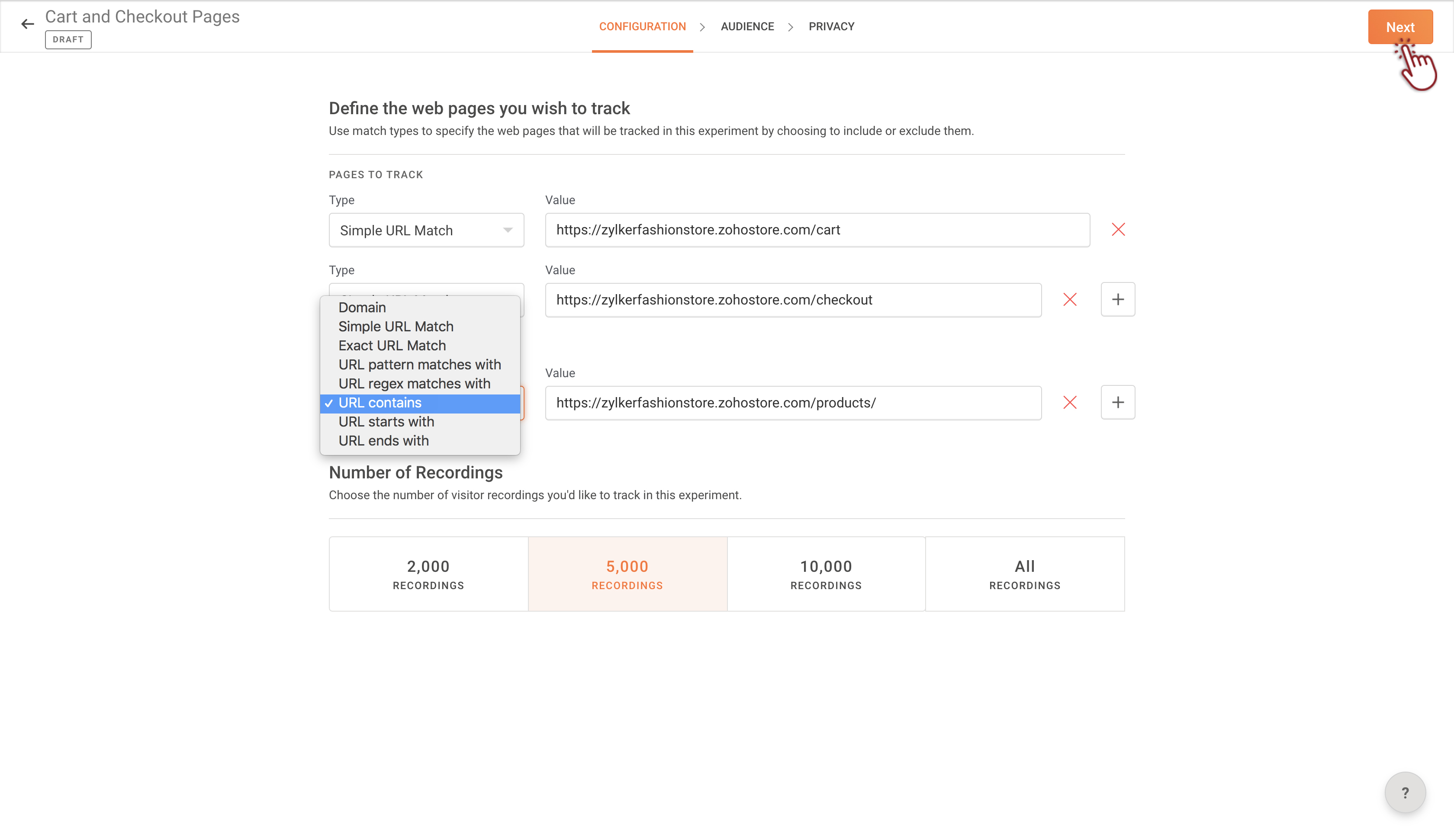 セッションレコーディングを詳細URLターゲティング設定で作成するには: