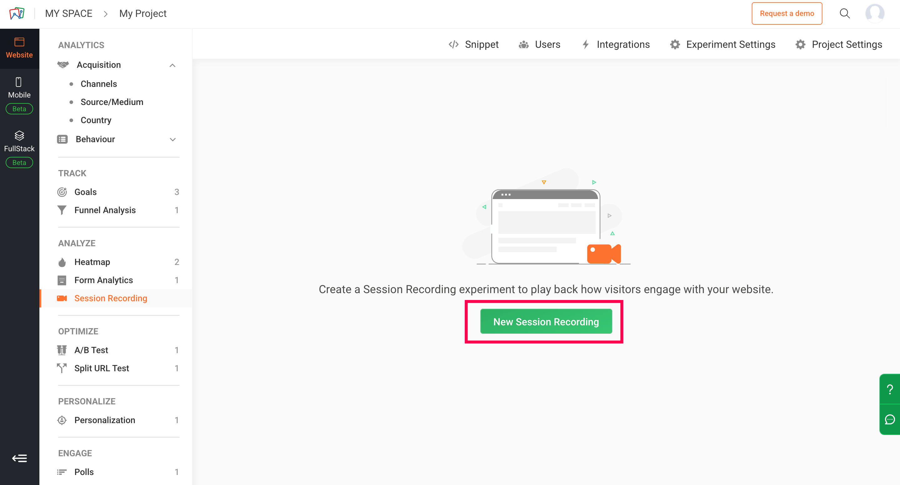 1. 左側のペインでSession Recordingをクリックし、 続いて新規 Session Recordingボタンをクリックします。