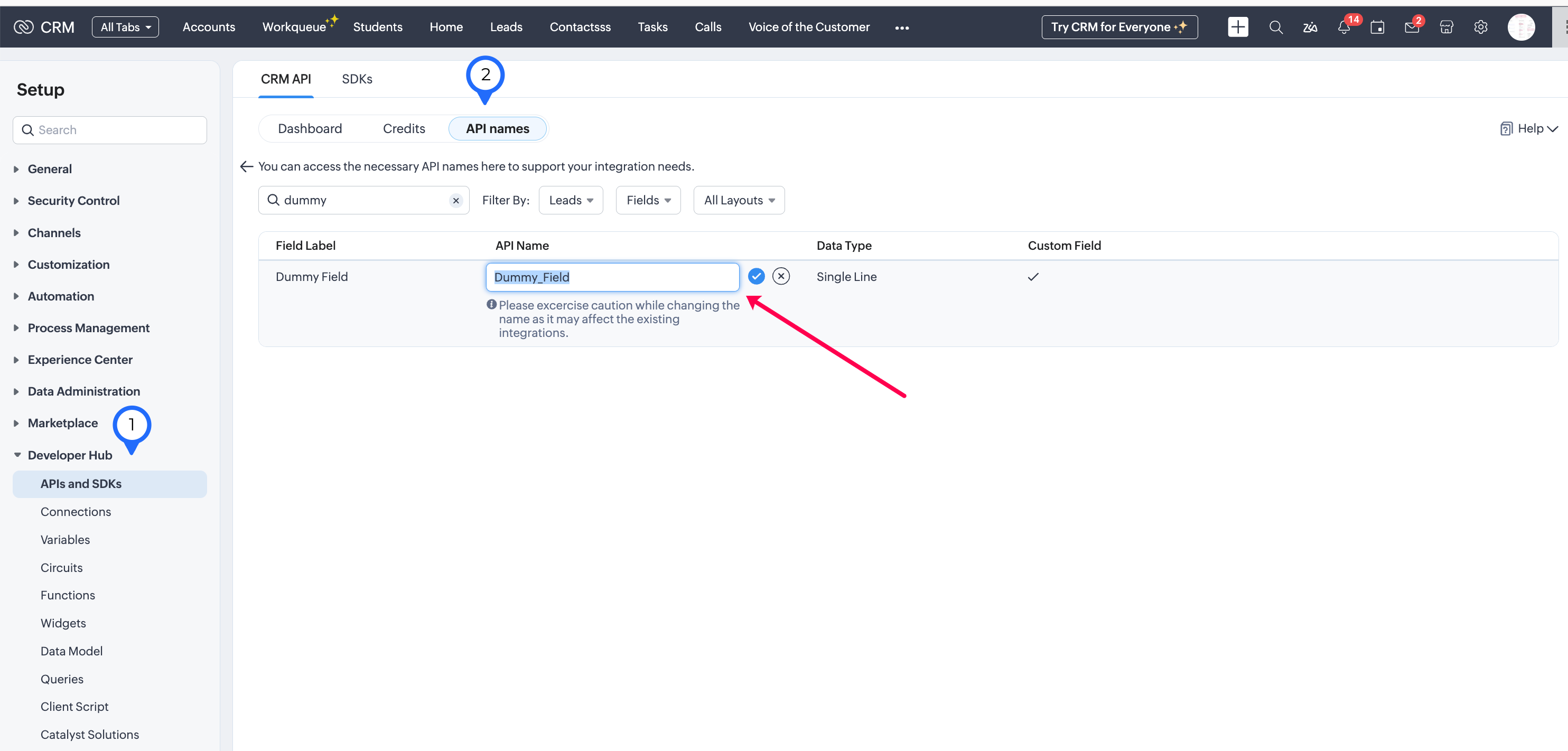 移動先:Zoho CRM の[設定](⚙️) >> [Developer Hub] >> [APIs and SDKs] >> [API Names] >> [タブ] >> API 名を変更