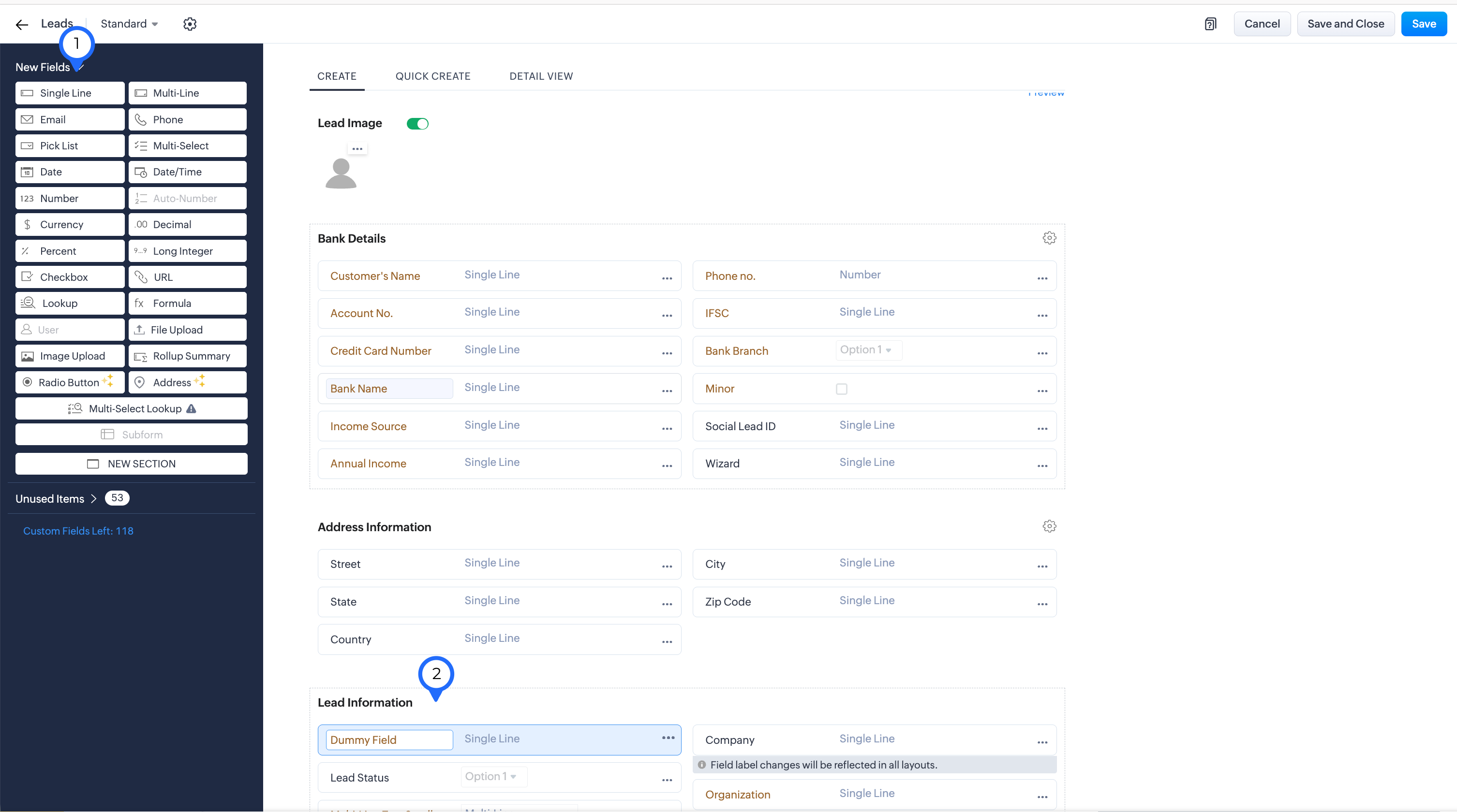 -> ユーザーは Zoho CRM で任意のタブ(例:連絡先)-> レイアウト に移動し、ダミー項目(例:1行テキスト)を追加してから、レイアウトを保存します。