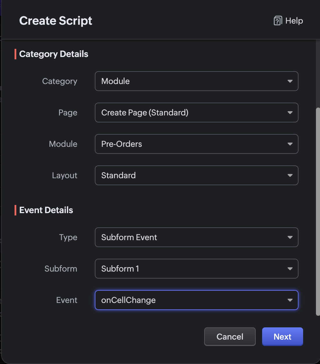 - Subform Event-> サブフォームとイベントを選択します(例:onCellChange)。