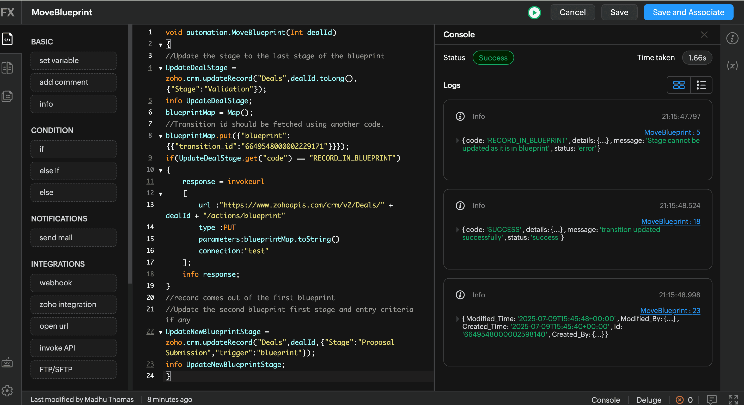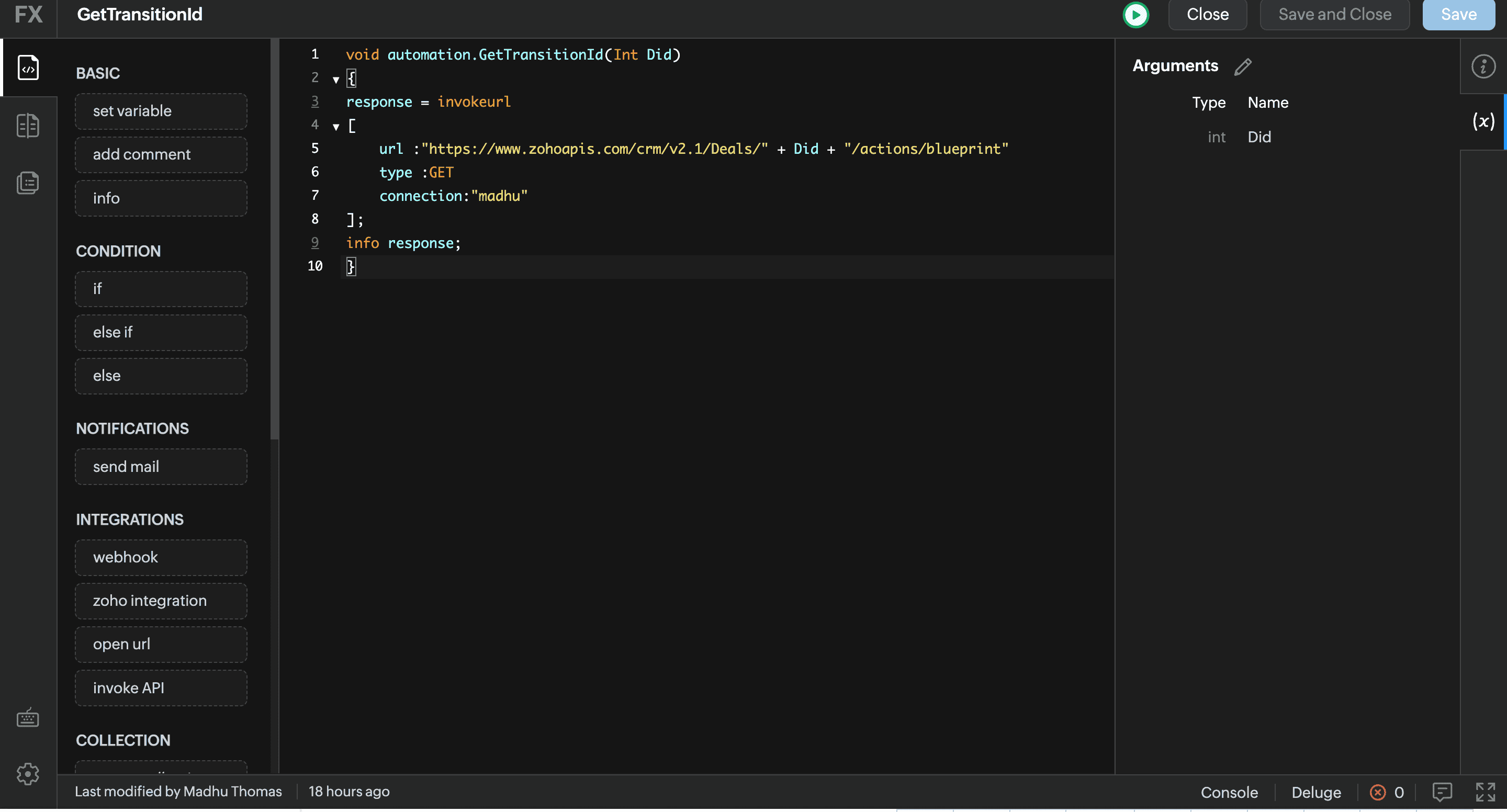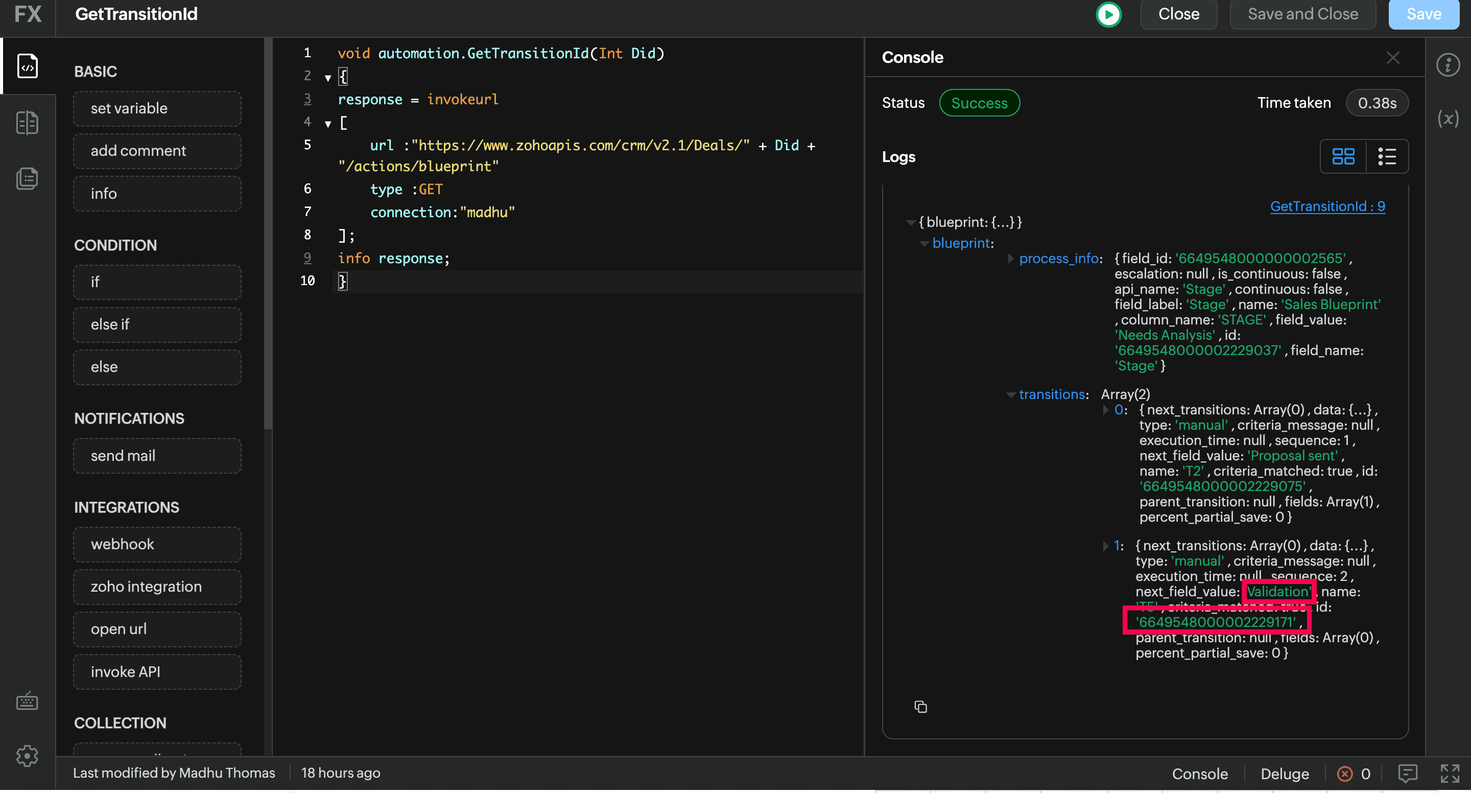 -> 意図した出力が得られているか確認するため、Zoho CRM Function IDE のコンソールセクションで各変数について info() ログを活用し、出力結果をチェックすることを推奨します。