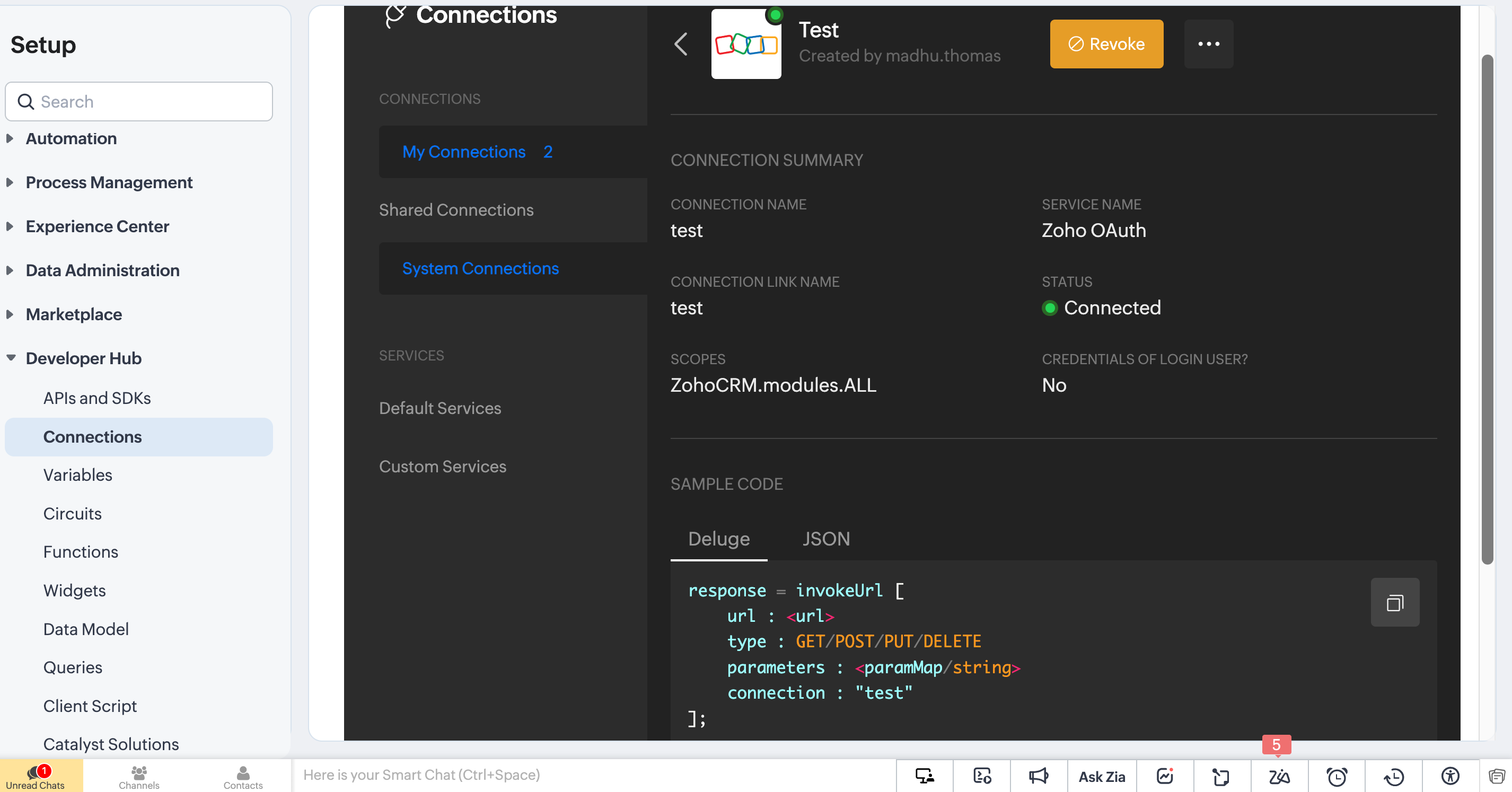 -> 関数スクリプト内で使用中の外部連携については、意図したAPI操作を行うために必須スコープが接続に追加されていることを必ずご確認ください。また、Deluge Invoke URLやIntegrationタスクに渡す際は、外部連携のリンク名(例:crm_connection)を使用するようにしてください。