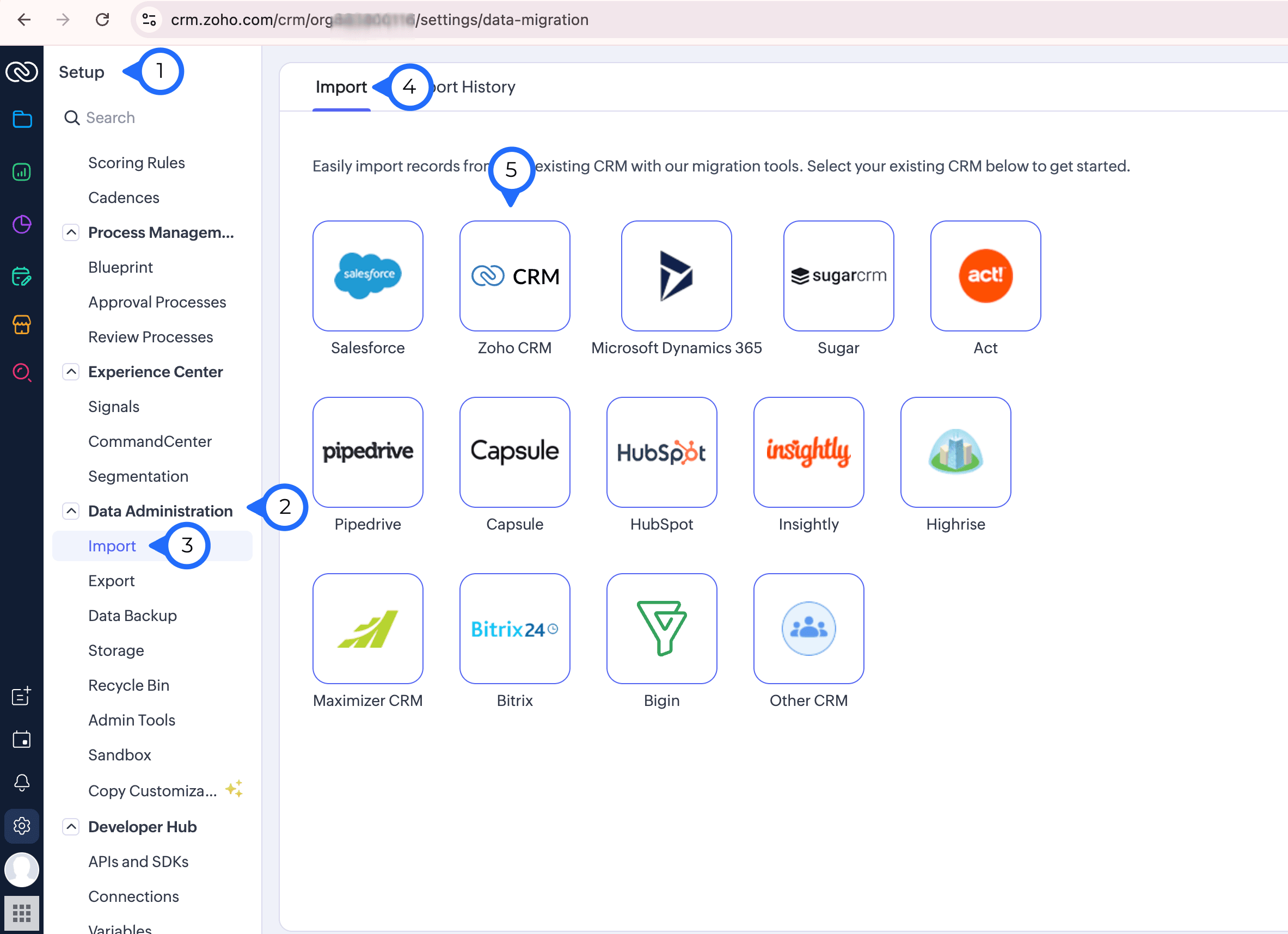 1. Zoho CRM で、設定 > データ管理 > インポート に移動してください。