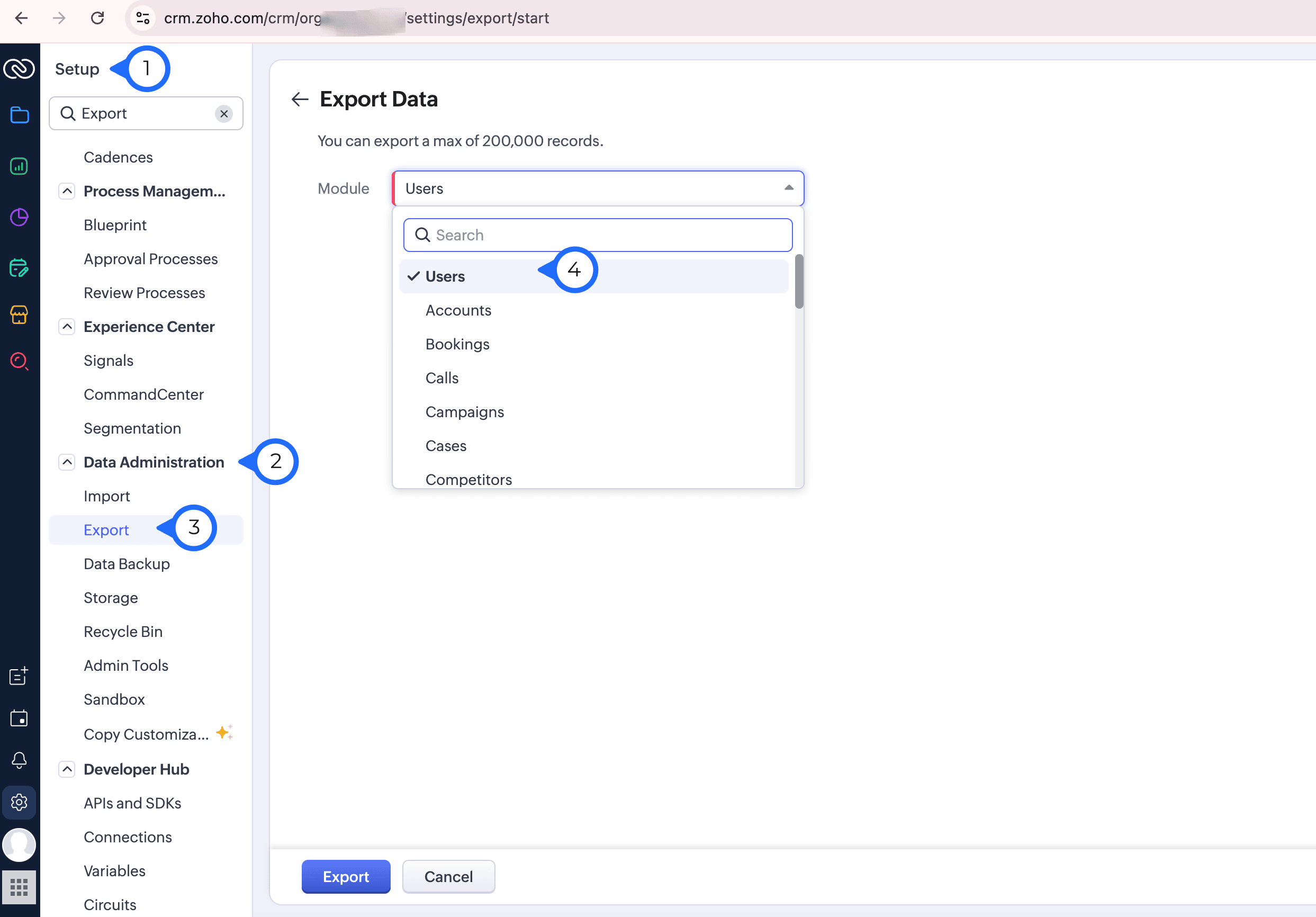 1. 「設定」>「データ管理」>「エクスポート」に移動し、ユーザー タブを選択します。