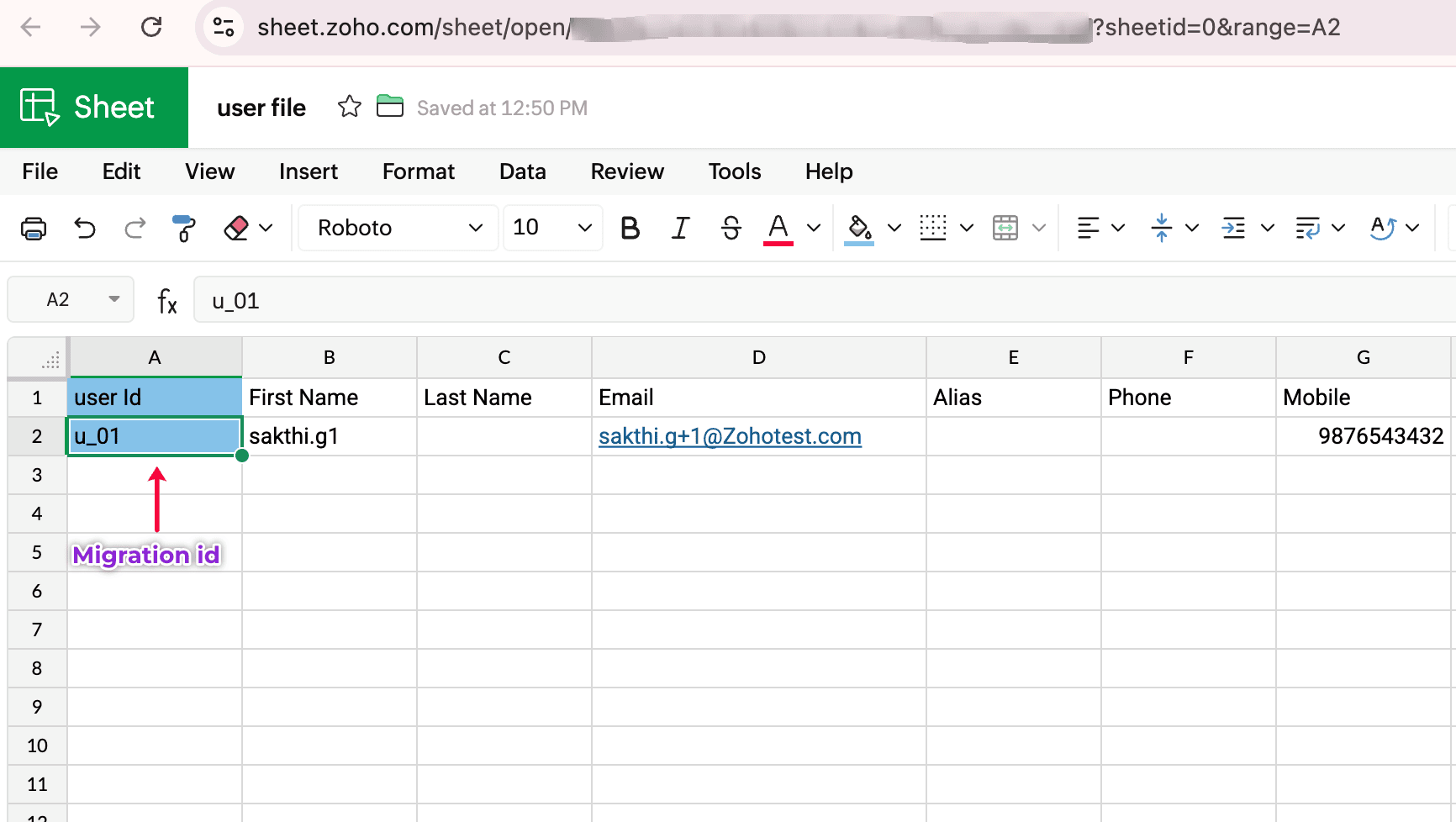 1. ファイル内の各ユーザーに対して Migration ID を追加してください。これにより、今後のデータ移行時にデータの紐付けが容易になります。