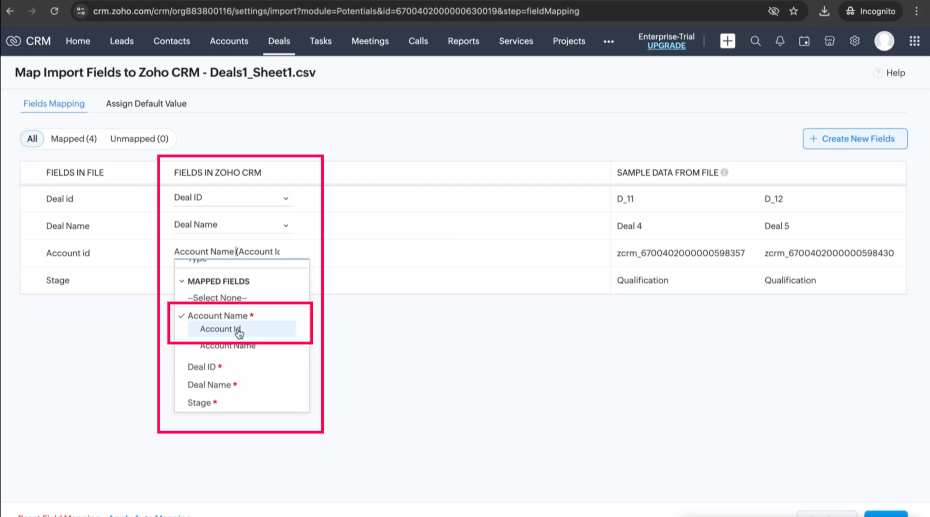 4. 続いて項目マッピングを行います。ここではCRM内の各項目とファイル内の該当項目をマッピングします。