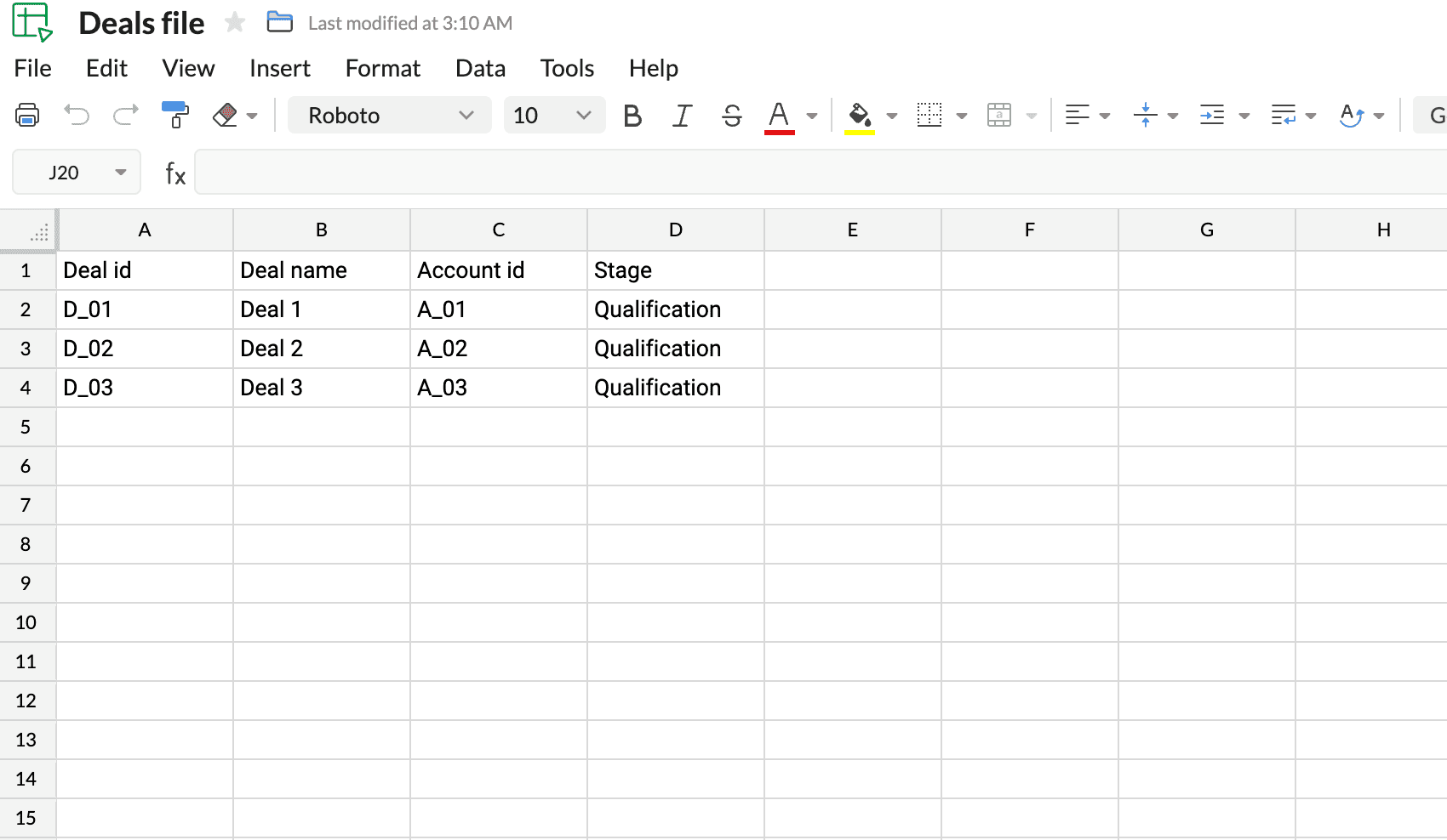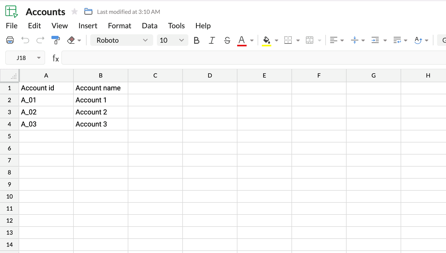 1) 今回は既存の商談に取引先を関連付けるため、商談ファイルのみを準備します。ファイル内でアカウント参照を更新するには、該当する列を作成し、既存取引先のSYSTEM作成済みIDを入力してください。