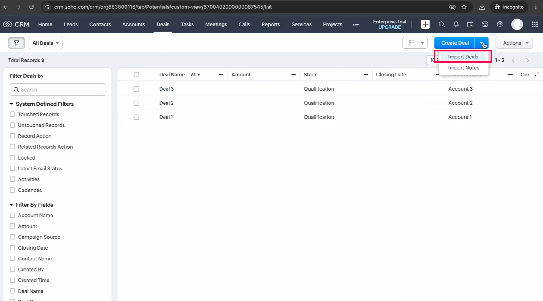 1. 商談タブ内のインポートオプションをクリックし、ファイルを選択します。