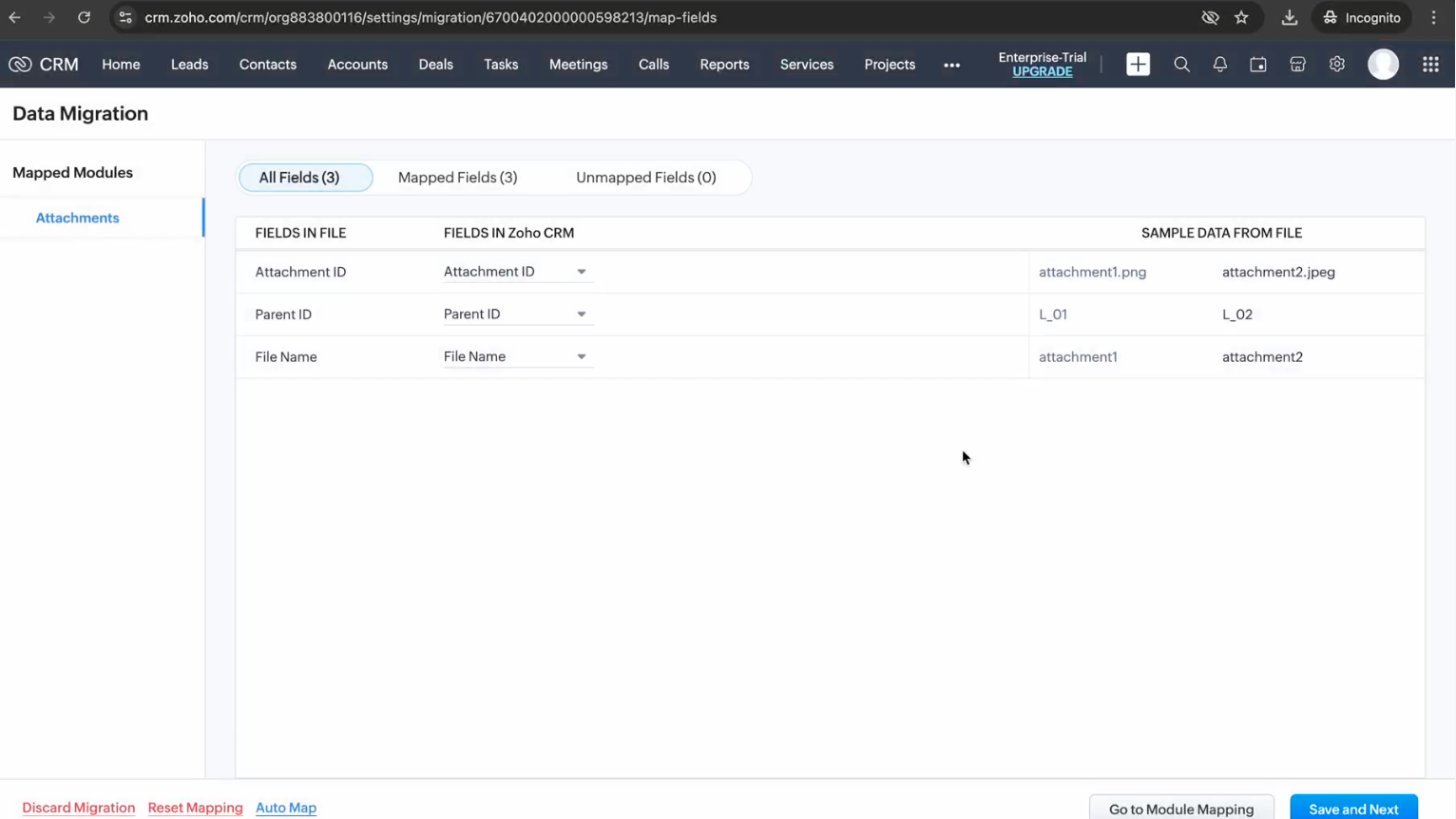 4. 次に、項目Mappingが表示され、CRM内の該当する項目をファイル内の該当する項目とマッピングします。