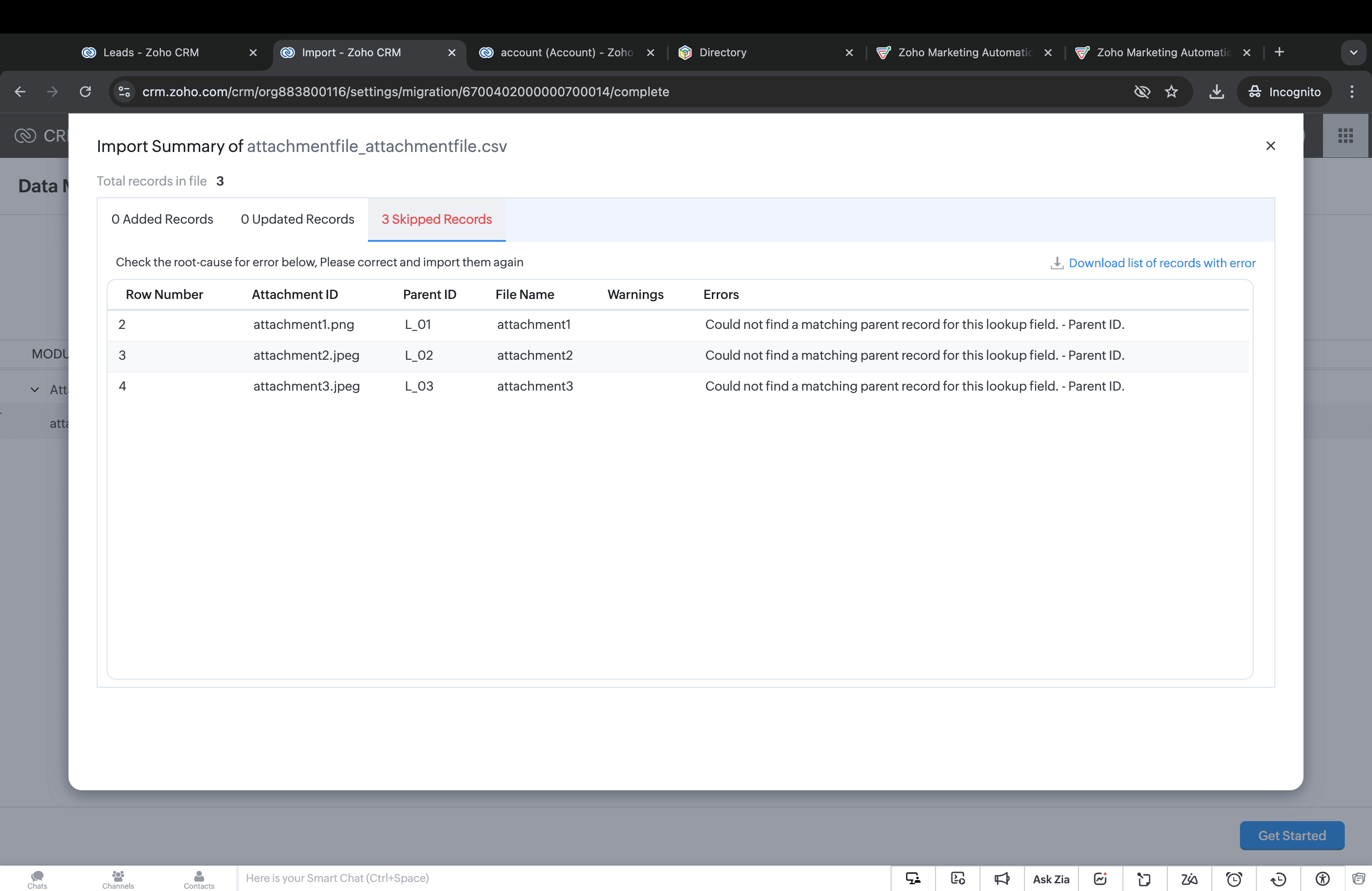 見込み客データが移行されていない、または見込み客ファイルで使用しているIDが添付ファイルに保存されているIDと一致しない場合、このエラーが発生します。