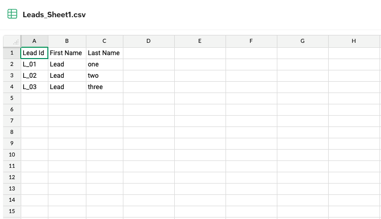 見込み客データを更新するために必要な各項目を列として含むデータファイルを事前にご用意ください。下記のサンプル見込み客ファイルのスクリーンショットをご参照いただけます。