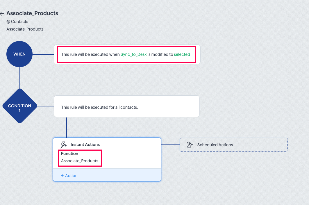 1. ワークフールールを作成し、Zoho CRMで商品が連絡先またはアカウントに関連付けられた際にトリガーされるようにします。