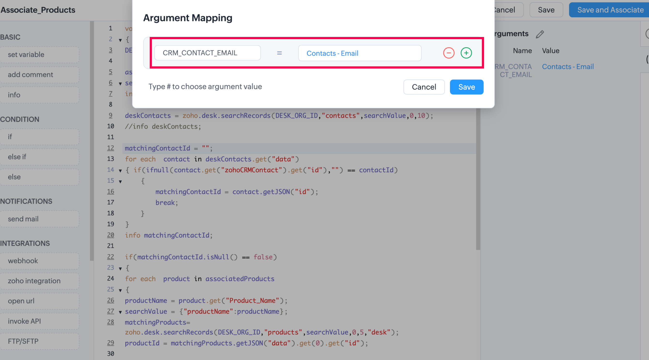 3. 商品を関連付ける– 取得したすべての商品を繰り返し処理し、「連絡先と商品を関連付ける」API を利用して、それぞれの商品と特定した連絡先をZoho Deskでリンクします。
