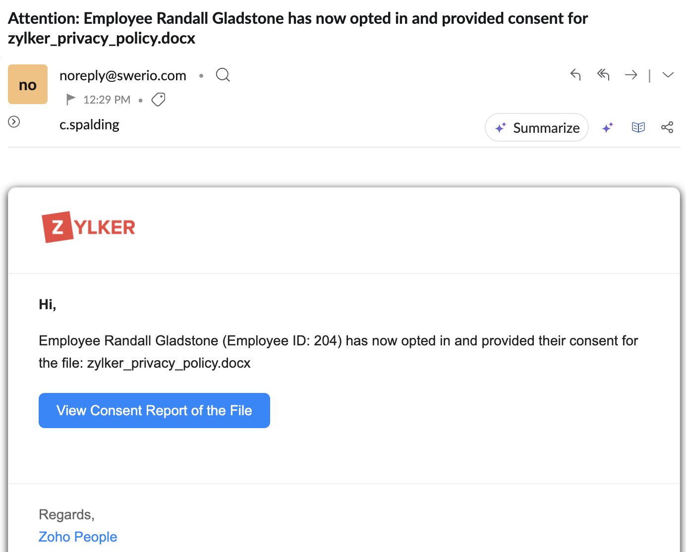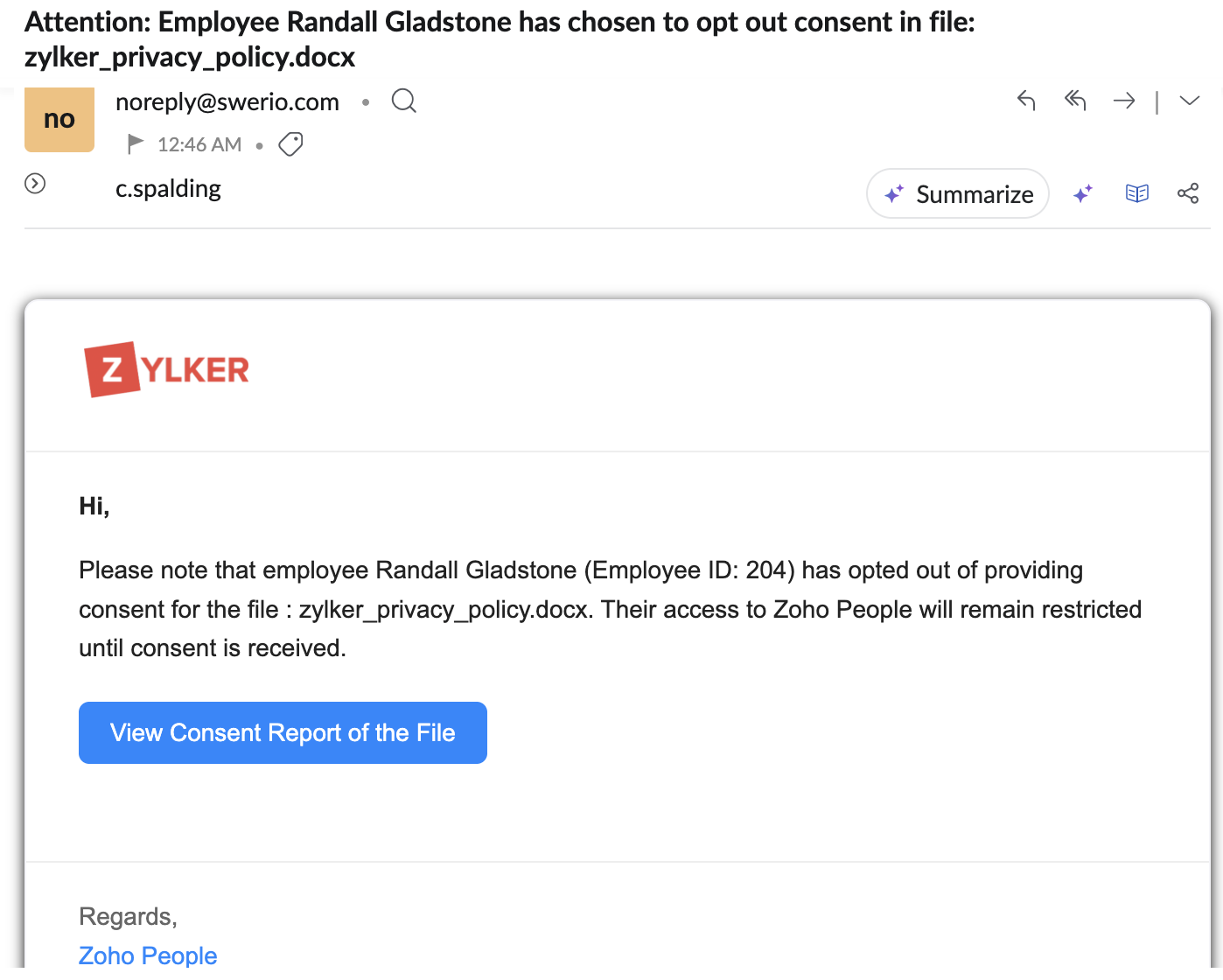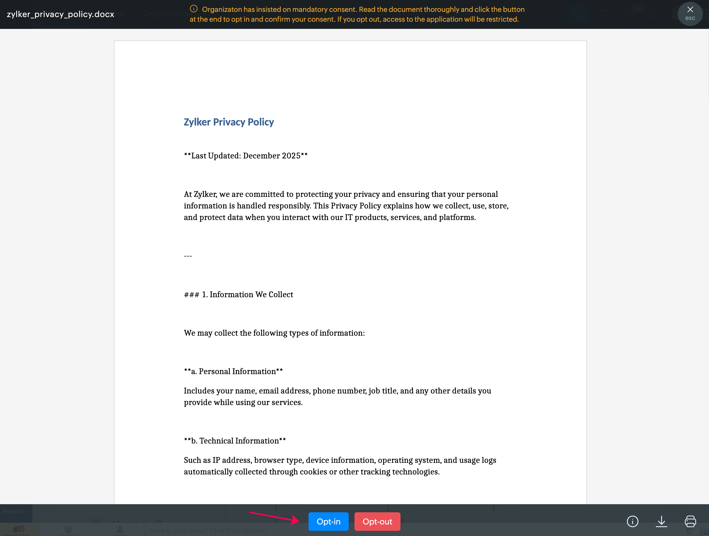 従業員の同意が必要なファイルがある場合は、その従業員がZoho Peopleにアクセスしたときにポップアップ画面が表示されます。
