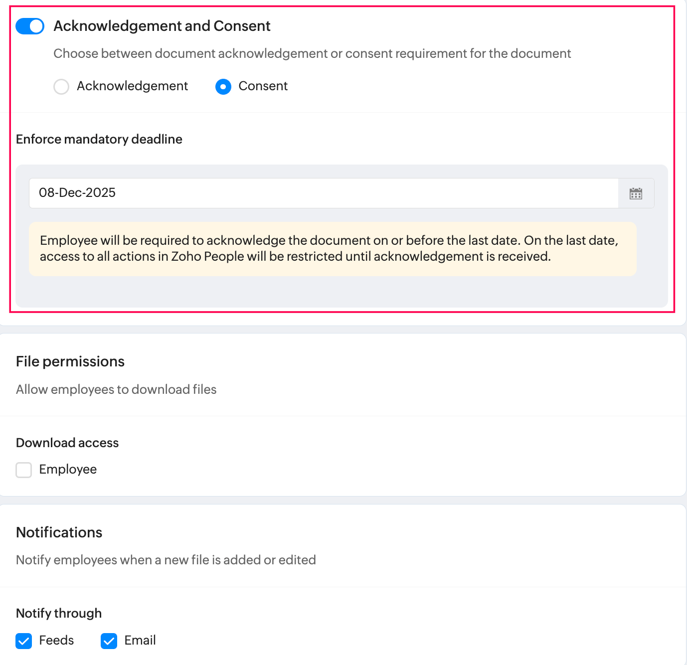 ✧ Zoho Peopleには、「同意」とは別に「受取確認」という機能もあります。両者は似ていますが別の機能です。1件のファイルに対して有効にできるのは「同意」か「受取確認」のどちらか一方です。