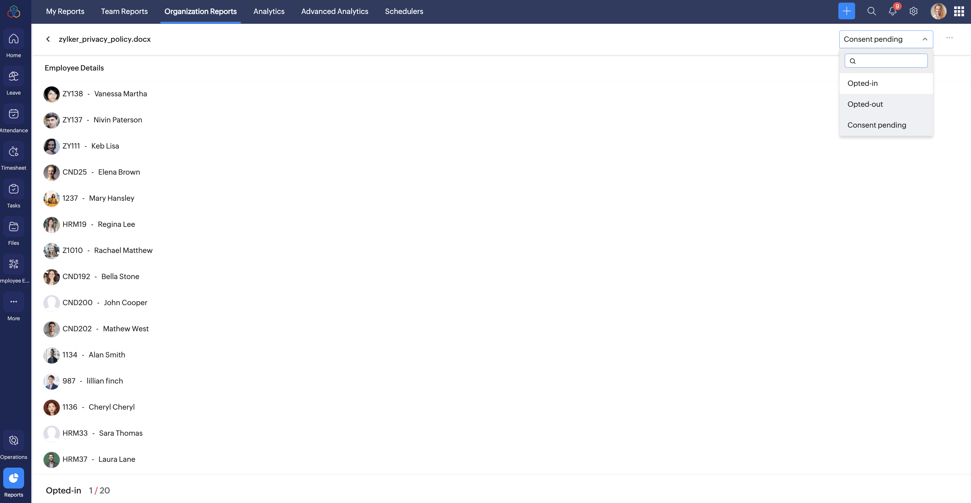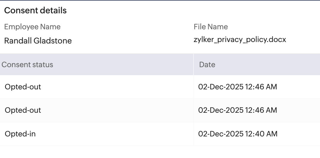 Zoho Peopleでは、重要な文書に対して従業員に同意を求めることができます。従業員へのファイルの共有から、同意の依頼、各従業員が同意したかどうかの管理までを効率的に実施できます。