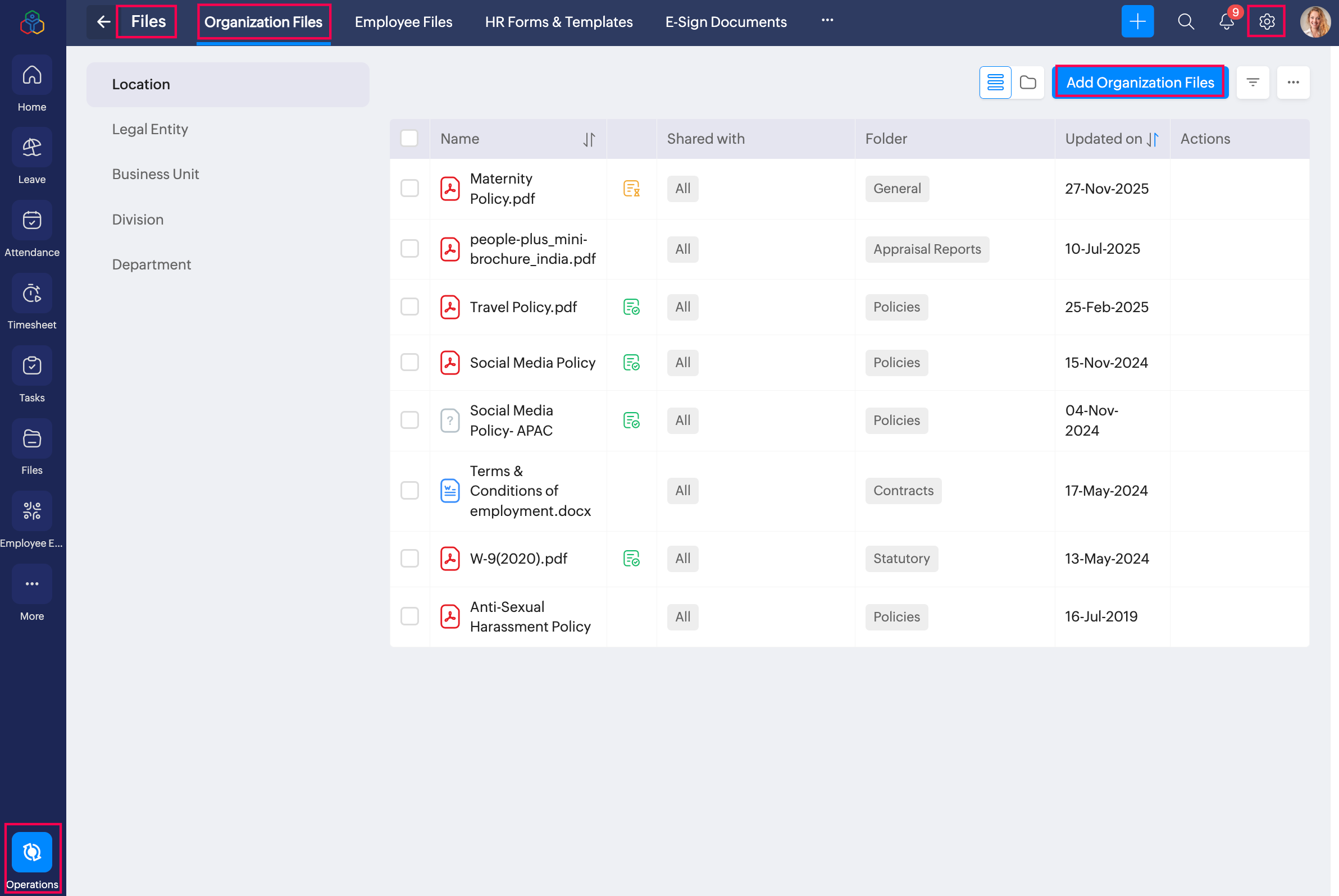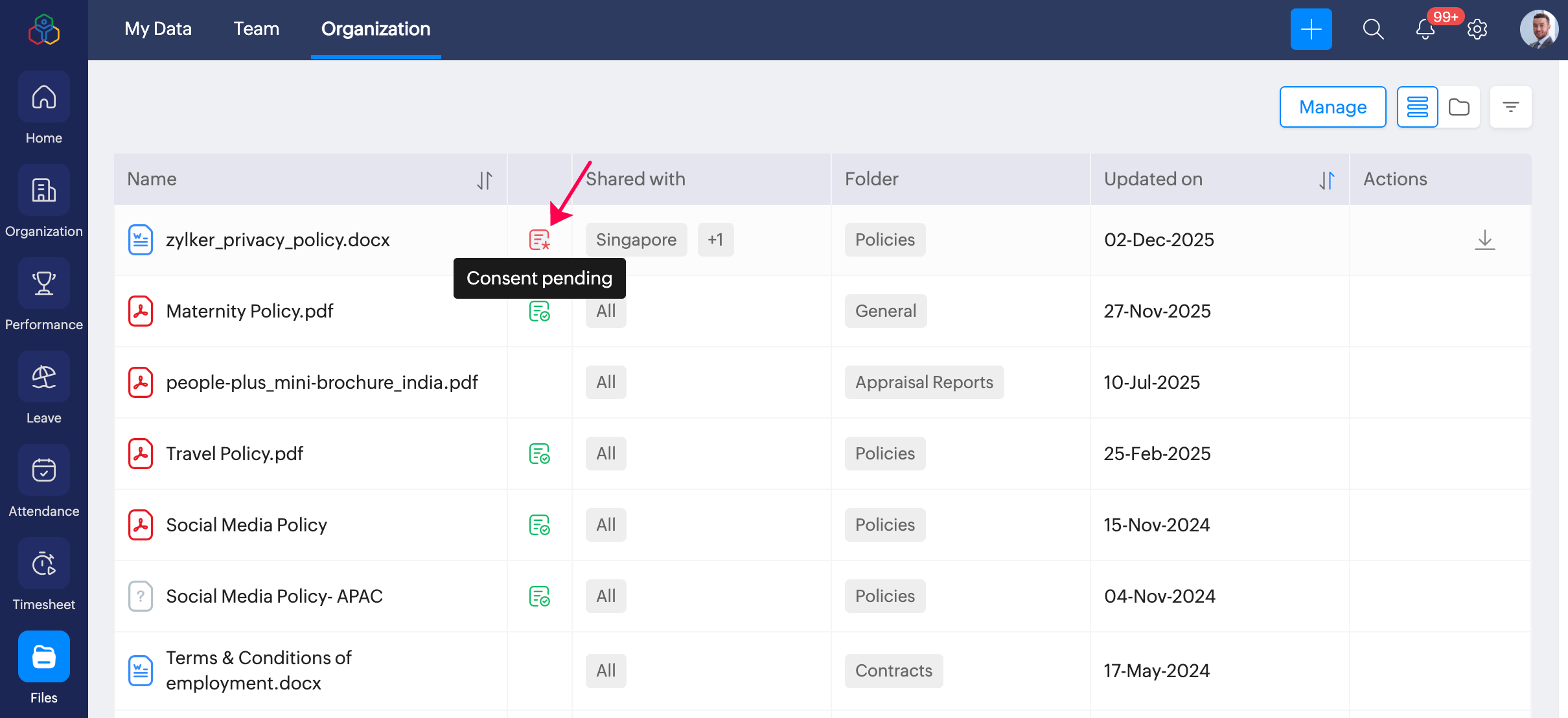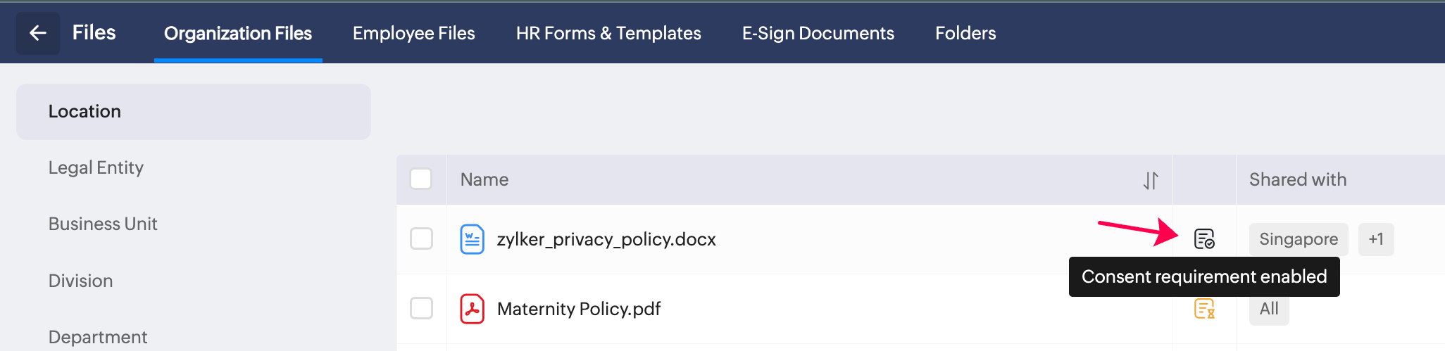 これで従業員にファイルを共有し、ファイルへの同意を求めることができます。下図のように、組織用ファイルの一覧ページでは、同意が必要であることがアイコンで示されます。従業員がファイルへの同意を完了すると、このアイコンの色が変わり、カーソルを合わせたときに表示されるヒントの内容も更新されます。
