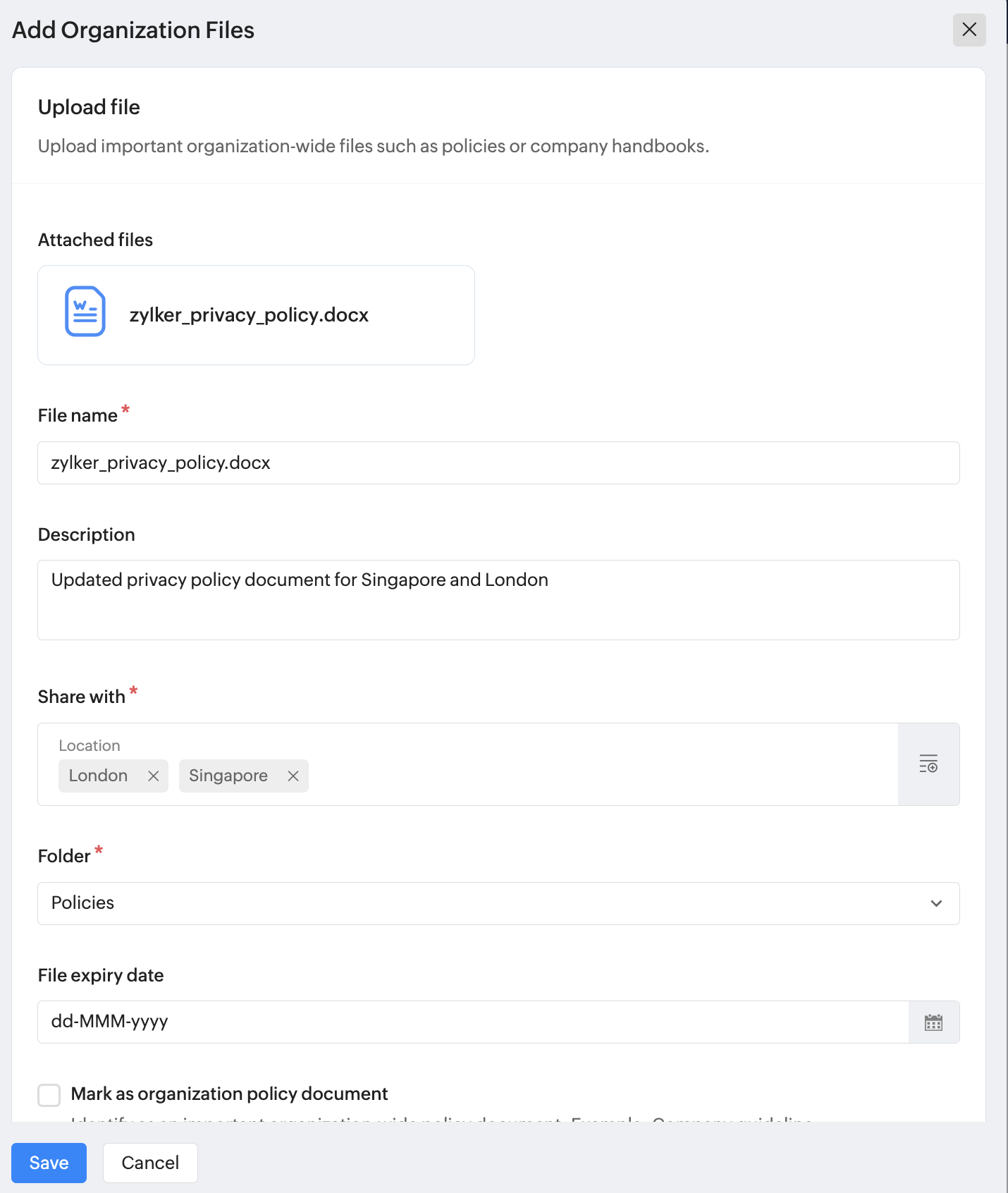 10. 必要に応じて、従業員にファイルのダウンロードを許可するかどうかと、自動通知を送信するかどうかを指定します。設定が完了したら、[保存する]をクリックします。