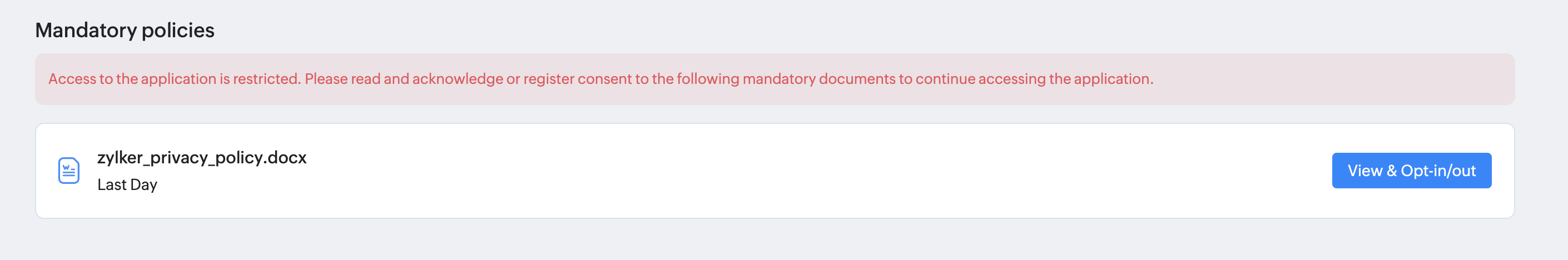 同意の期限を過ぎると、従業員はファイルへの同意を行わない限り、Zoho Peopleにアクセスできなくなります。画面には、下図のようなメッセージが表示されます。