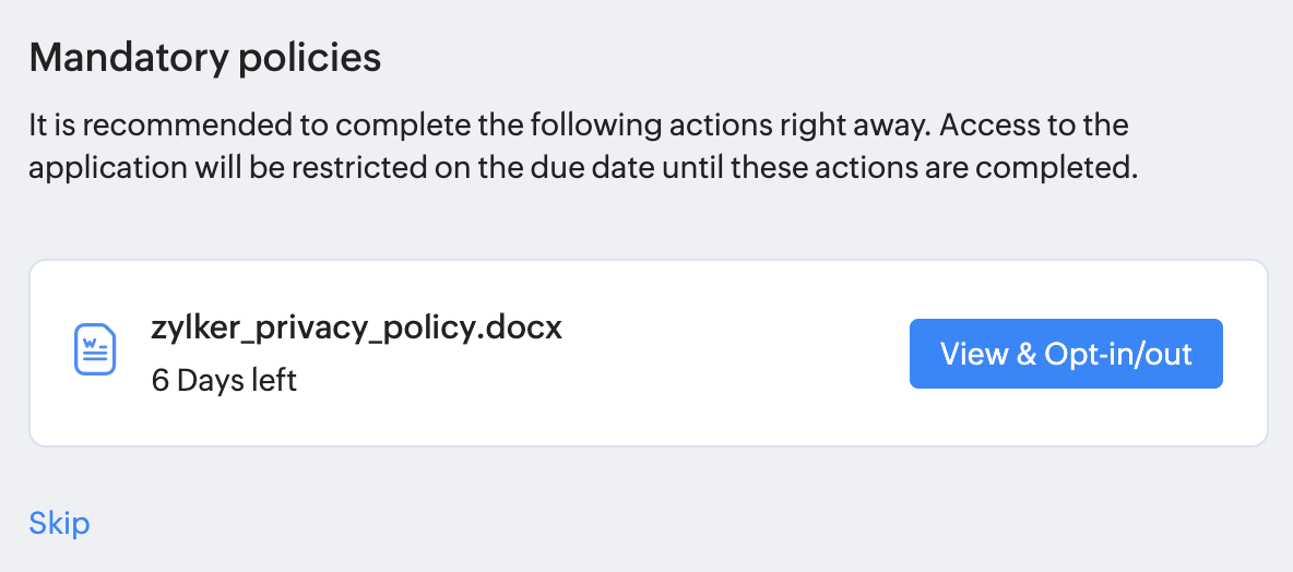ファイルへの同意を求められた従業員は、同意をするとZoho Peopleへのアクセスが許可されます。同意を拒否した場合は、Zoho Peopleへアクセスできなくなります。