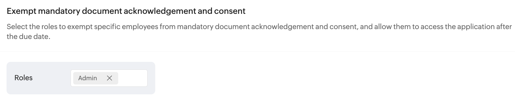 従業員による同意を必須とする場合でも、特定の役割の従業員については同意を免除できます。免除する役割を設定するには、[設定][ファイル][一般]の順に移動し、一番下にある[文書の受取確認および同意の必須化を免除する]の欄でドロップダウンから役割を選択します。