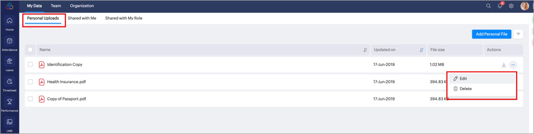 従業員は、個人用ファイルの追加/管理、自分や自分の役割に共有されたファイルの表示やファイルの受取確認といった操作を行うことができます。 ファイルメニューには、次の3つのタブがあります。 [自分のデータ] [チーム] [組織] 自分のデータ [自分のデータ]タブの下にある[個人用ファイルのアップロード]では、個人用ファイルのアップロード/編集/削除を行うことができます。また、自分や自分の役割に共有されたファイルを表示することもできます。 チーム ...
