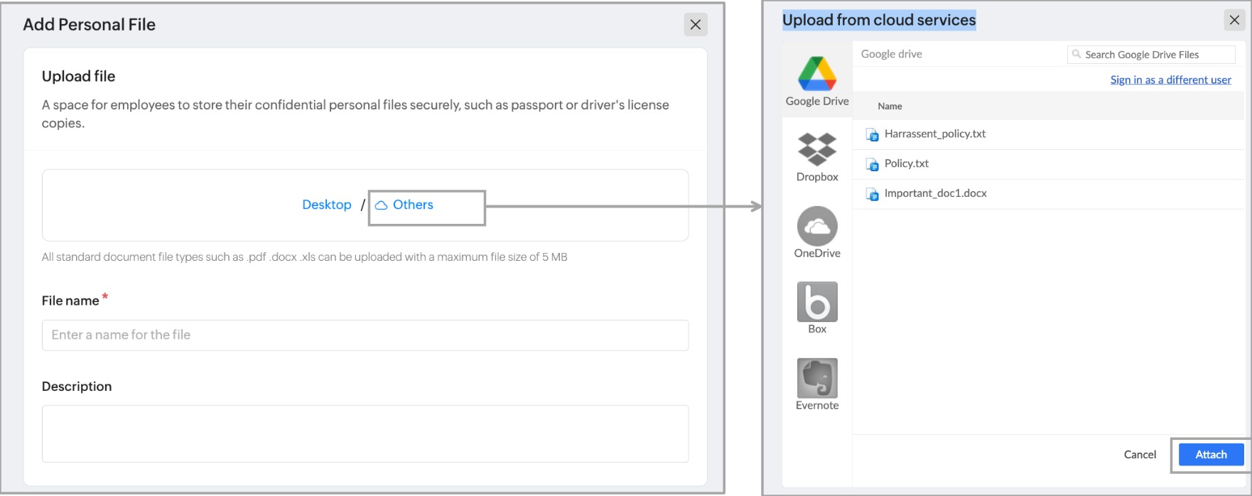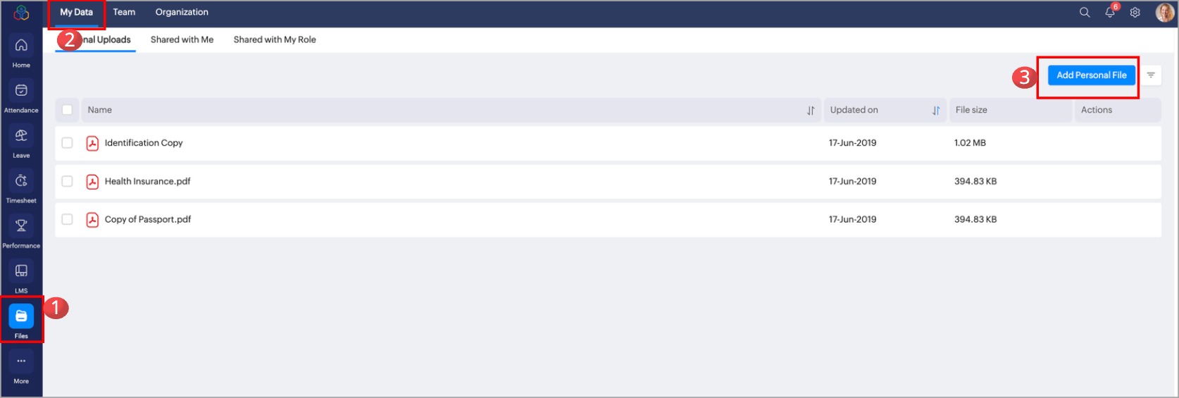 Zoho Peopleには、従業員が個人ファイルをアップロードできるスペースが用意されています。個人用ファイルのアップロードにアクセスできるのは、従業員のみです。管理者は、従業員の個人用ファイルにアクセスできません。組織には1GBの個人用のアップロード容量が割り当てられます。このスペースは、従業員の間で共有して使用され、運転免許証やパスポートのコピーなど、個人的な文書やファイルを保管できます。