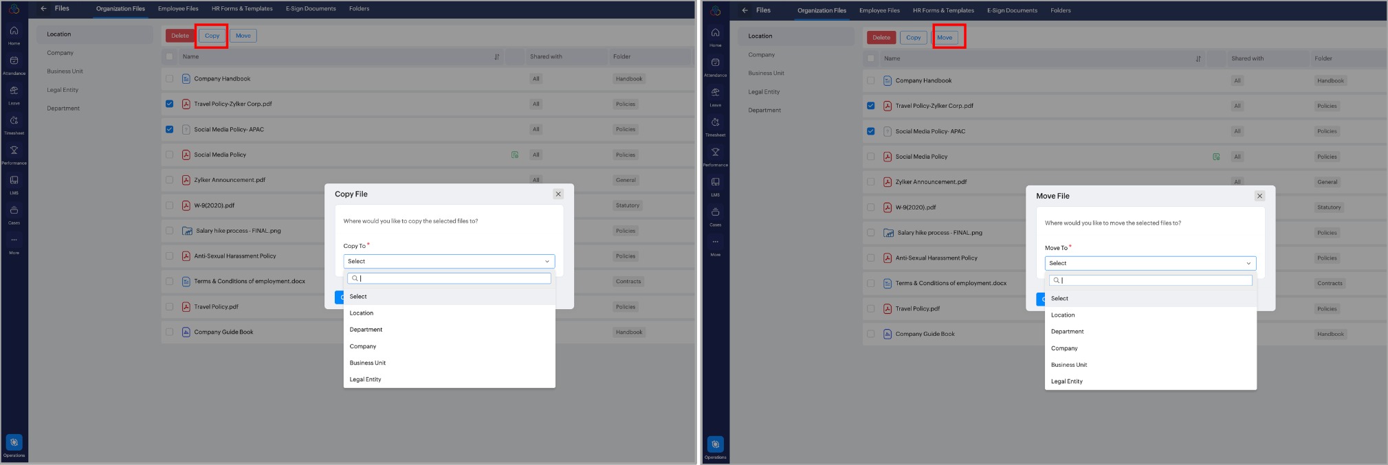 組織用ファイルに追加されたファイルは、他の場所/組織/事業単位/法人/部署にコピーまたは移動して、利用できます。