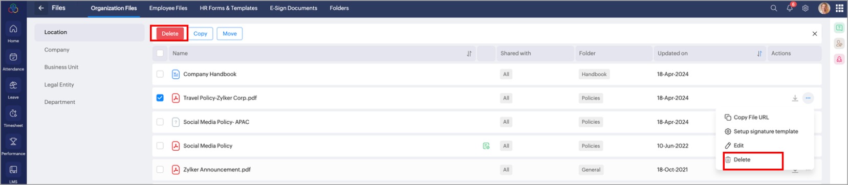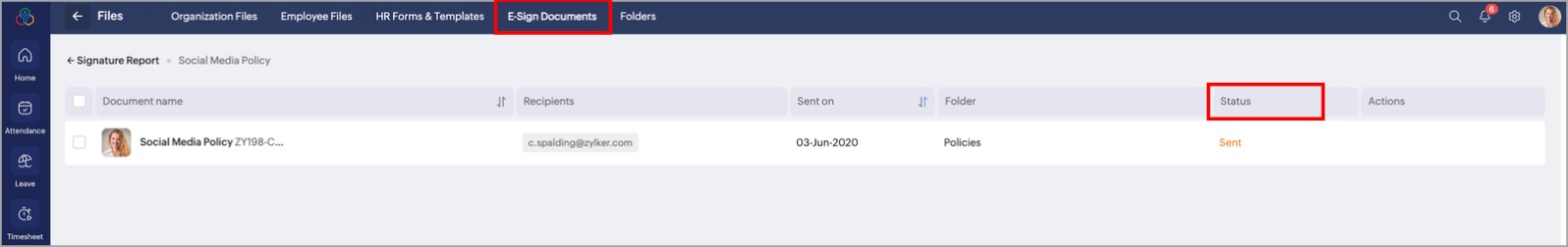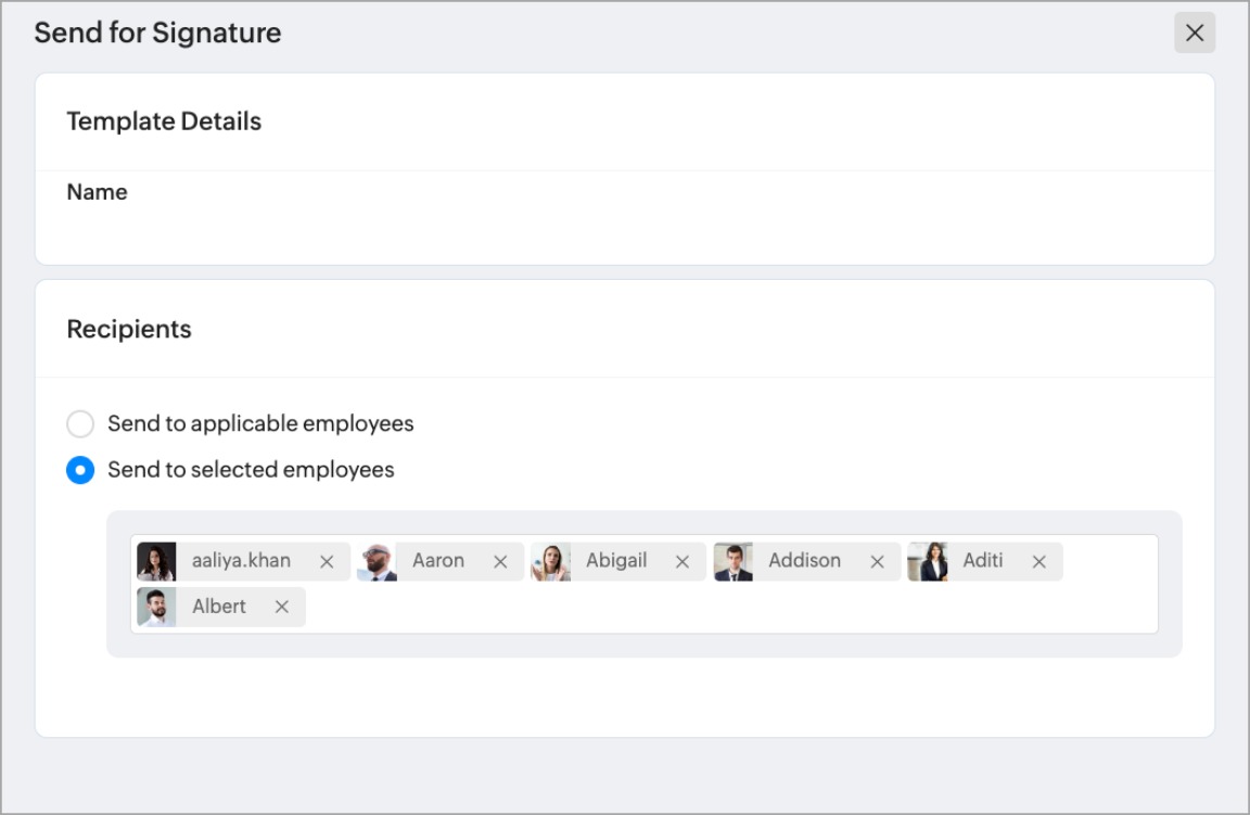 署名テンプレートを設定すると、組織用ファイルを従業員に送信して署名を依頼できます。この機能を利用するには、Zoho Signとの連携が必要です。署名テンプレートの設定/編集についての詳細は、電子署名テンプレートを参照してください。