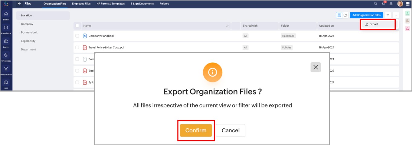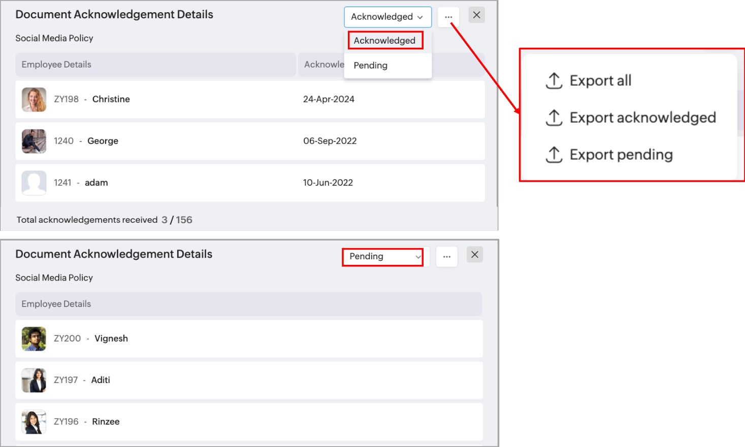 ドロップダウンから[受取確認済み]または[保留中]を選択して、従業員の受取確認のステータスを確認できます。さらに、受取確認のレポートをエクスポートすることもできます。