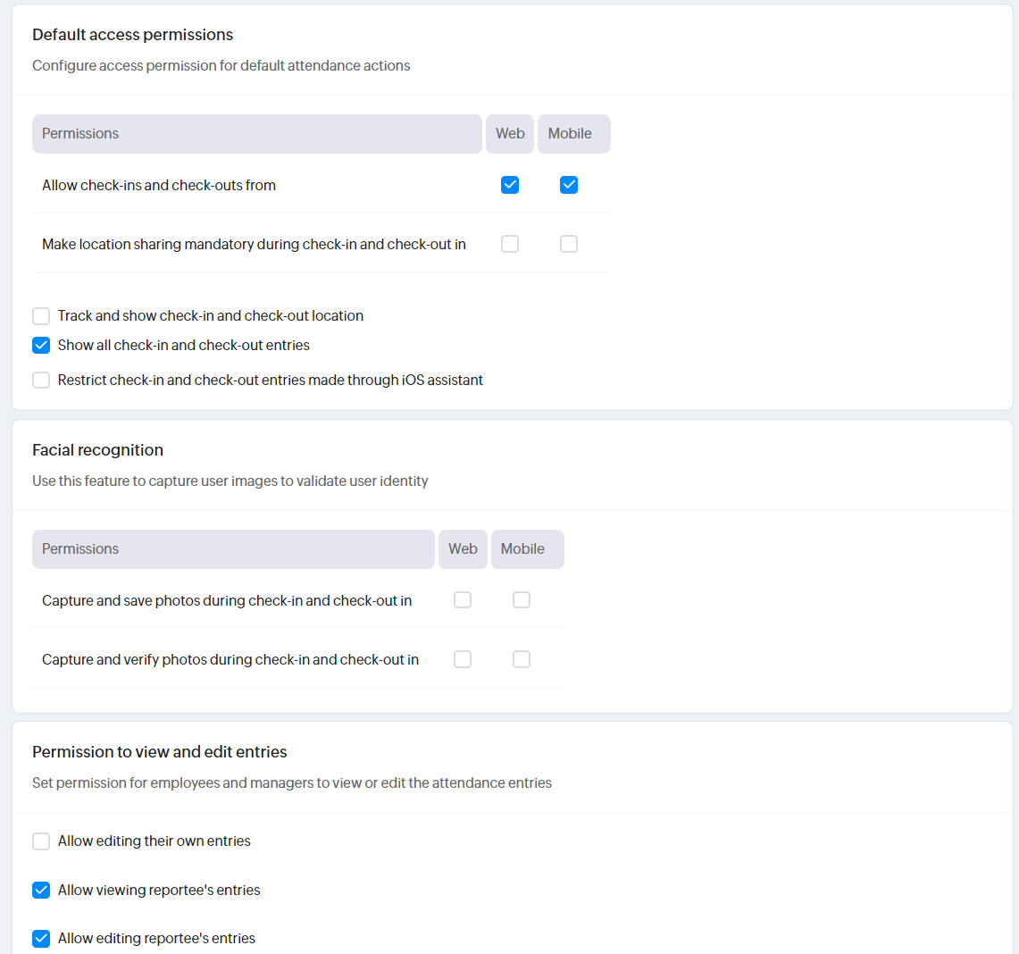 「出勤/退勤の場所を追跡して表示する」/「すべての出勤/退勤データを表示する」:この設定を有効にすると、位置情報と出退勤データを表示できます。