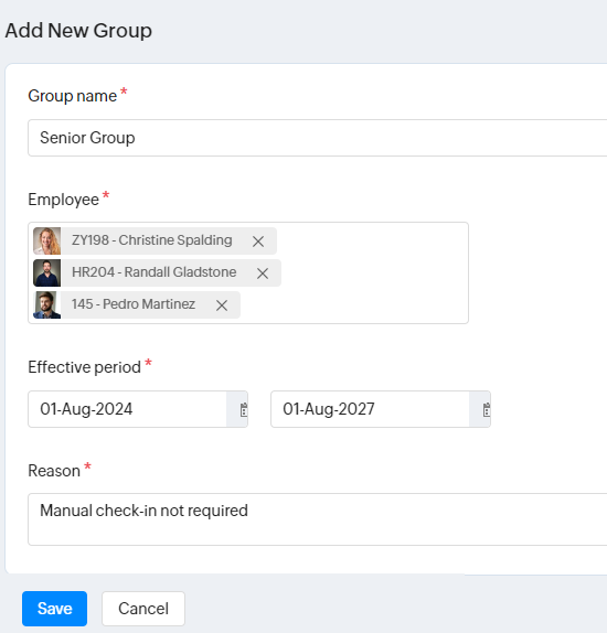 この機能では、グループを作成し、特定のユーザーを追加し、開始日と終了日を入力することで、従業員の出勤を自動的に記録する必要がある期間を指定できます。