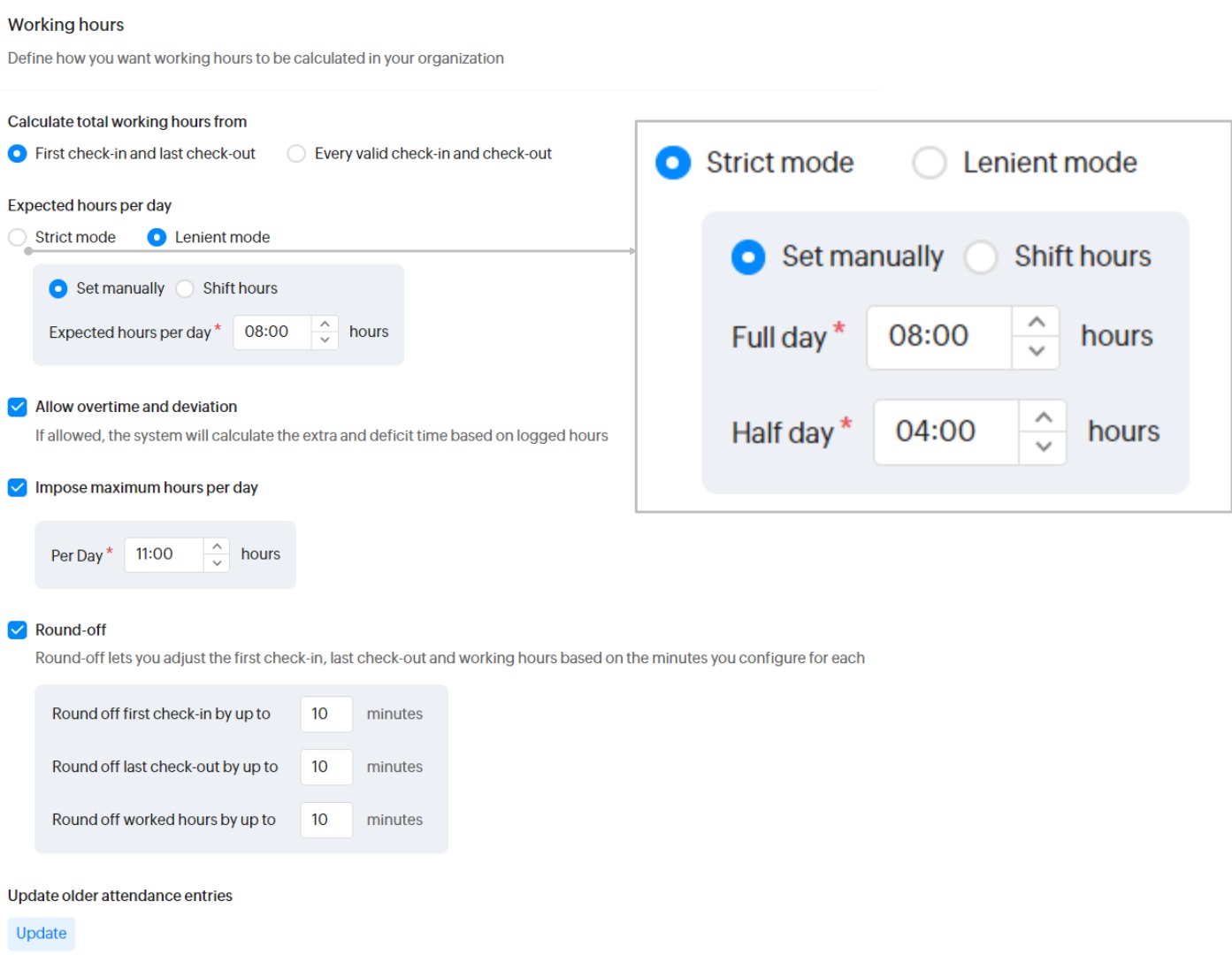 厳密モードで半日勤務を4時間、全日勤務を8時間と設定していて、実際には7時間しか出勤しなかった場合、半日出勤で半日不在として記録されます。残りの1時間は、不足として表示されます。5時間のみ出勤した場合は、半日出勤で半日不在、3時間分不足として記録されます。一方、10時間出勤した場合は、全日出勤で2時間分が超過として記録されます。