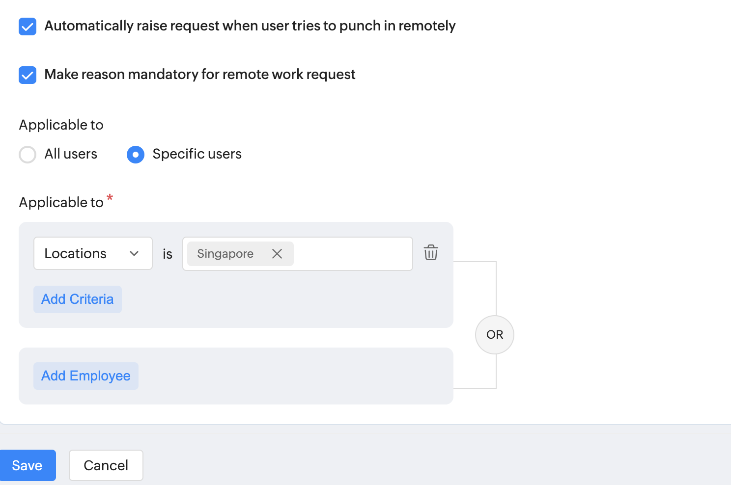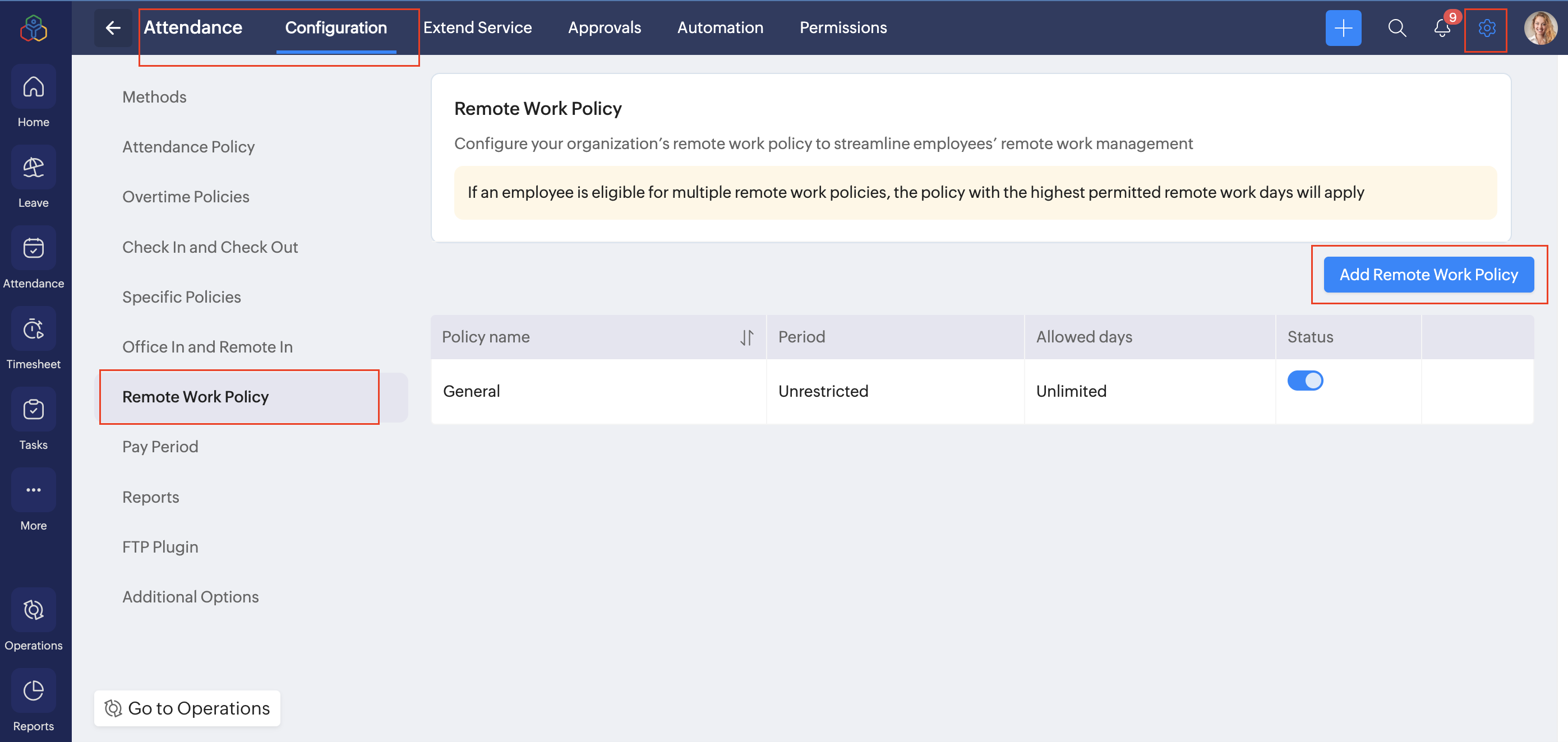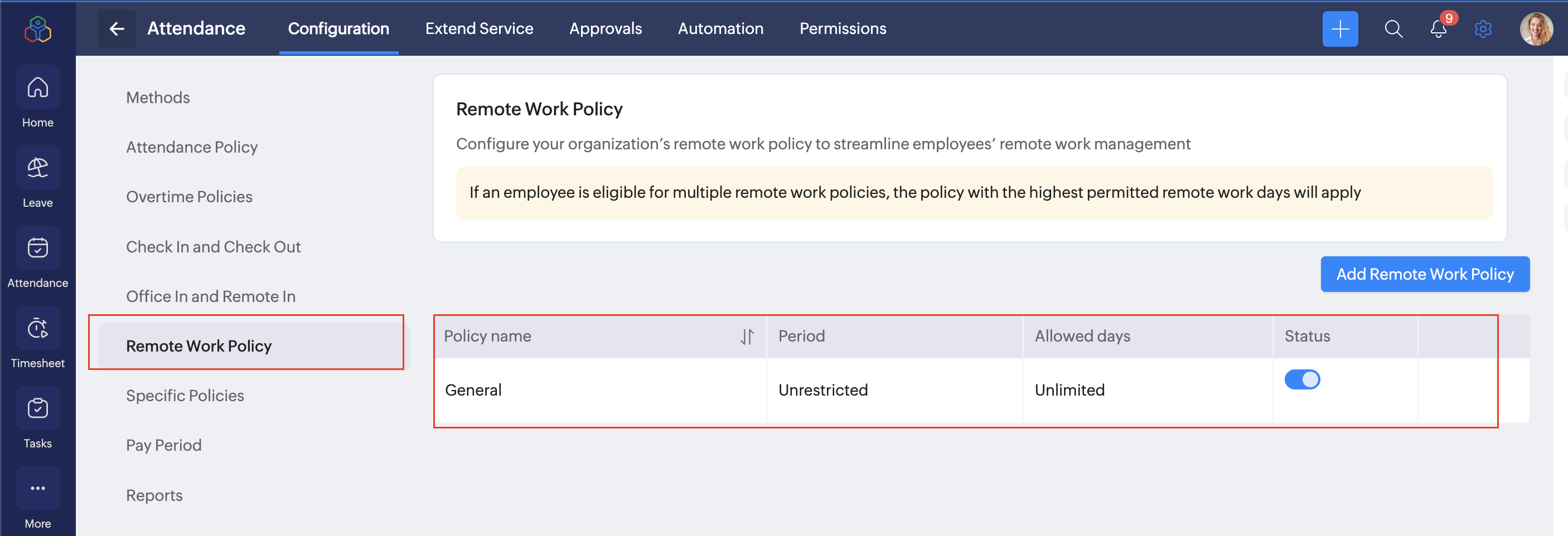 Zoho People でリモートワーク規定を設定する前に、Office In と Remote In 設定が[勤怠方法]で有効になっていることを確認してください。詳細については、勤怠方法を有効にするを参照してください。