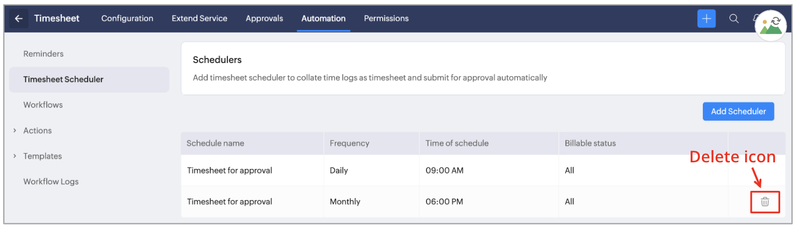 3. スケジュール処理を削除するには、スケジュール処理の上でマウスをホバーし、削除アイコンをクリックします。