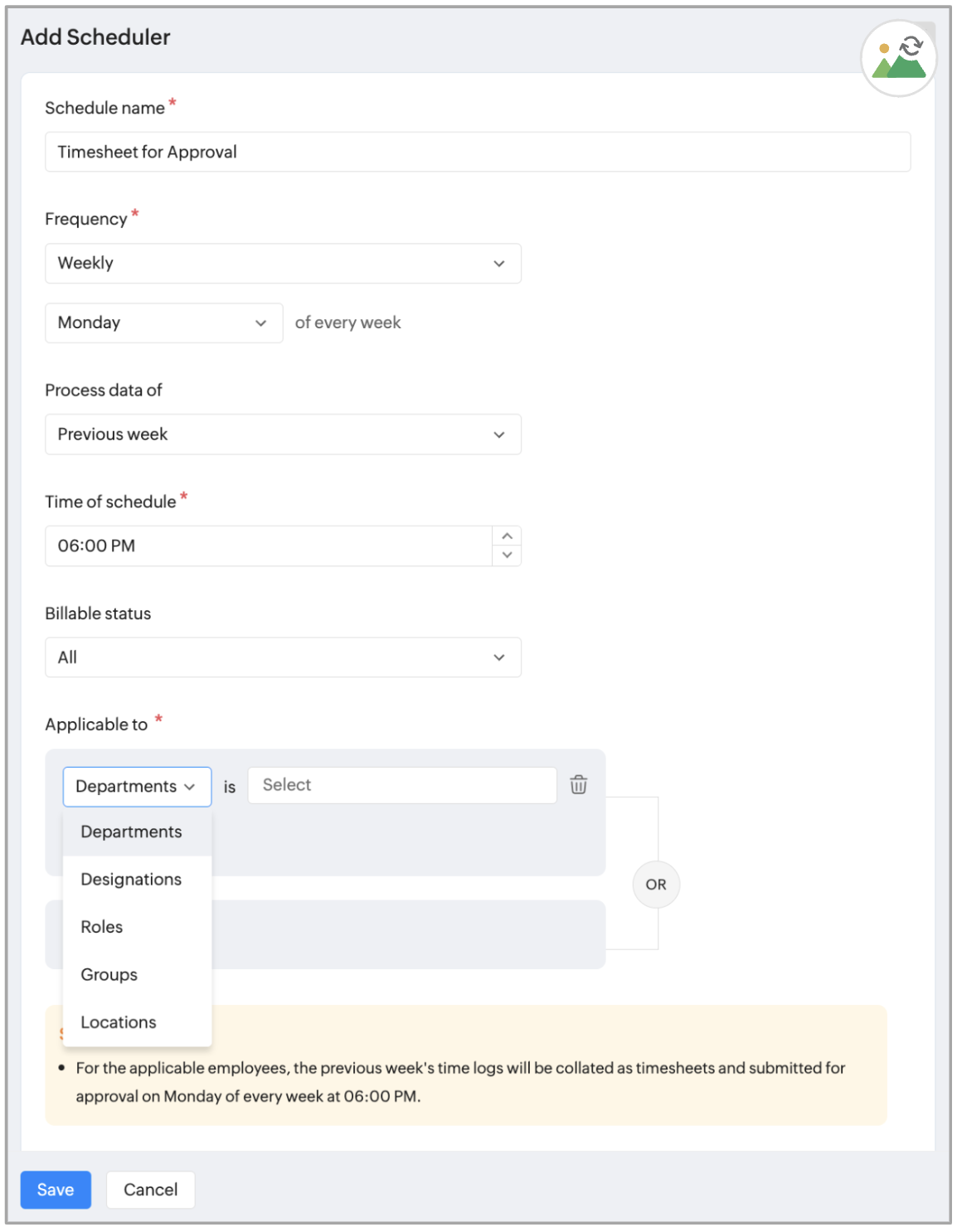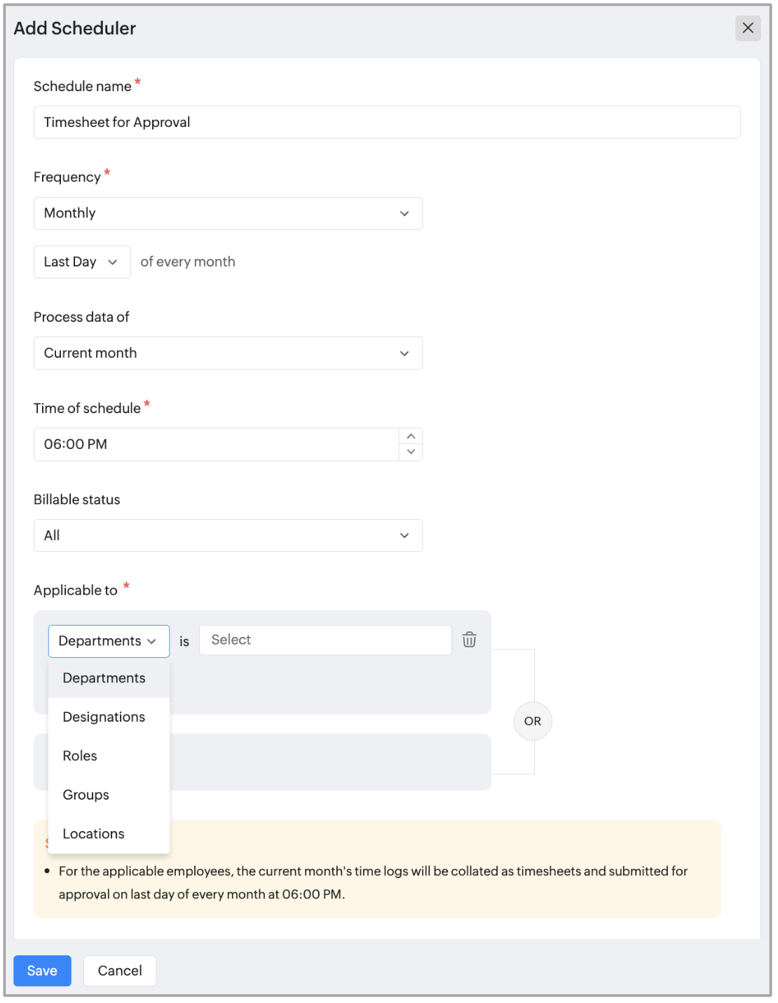 2. 適用対象に選択した設定(従業員を除く)はAND条件で動作します。 従業員オプションはOR条件で動作します。 例えば、HR(部署)、マネージャー(役割)、ジョン(従業員)が選択されている場合、スケジュールはすべてのHRマネージャーまたはジョンに適用されます。