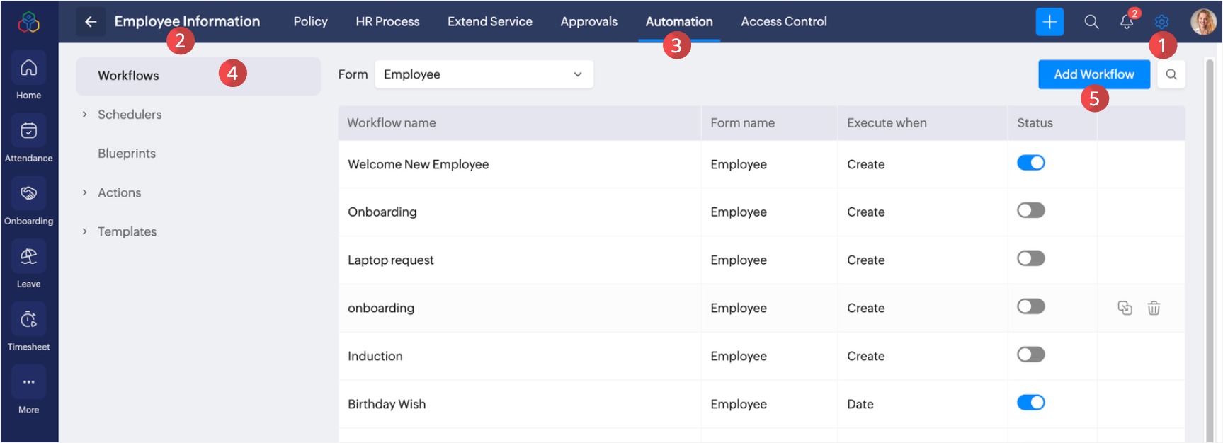 1. ホームページから、設定 > サービスを選択 > ワークフロー > ワークフローを追加へ移動します。