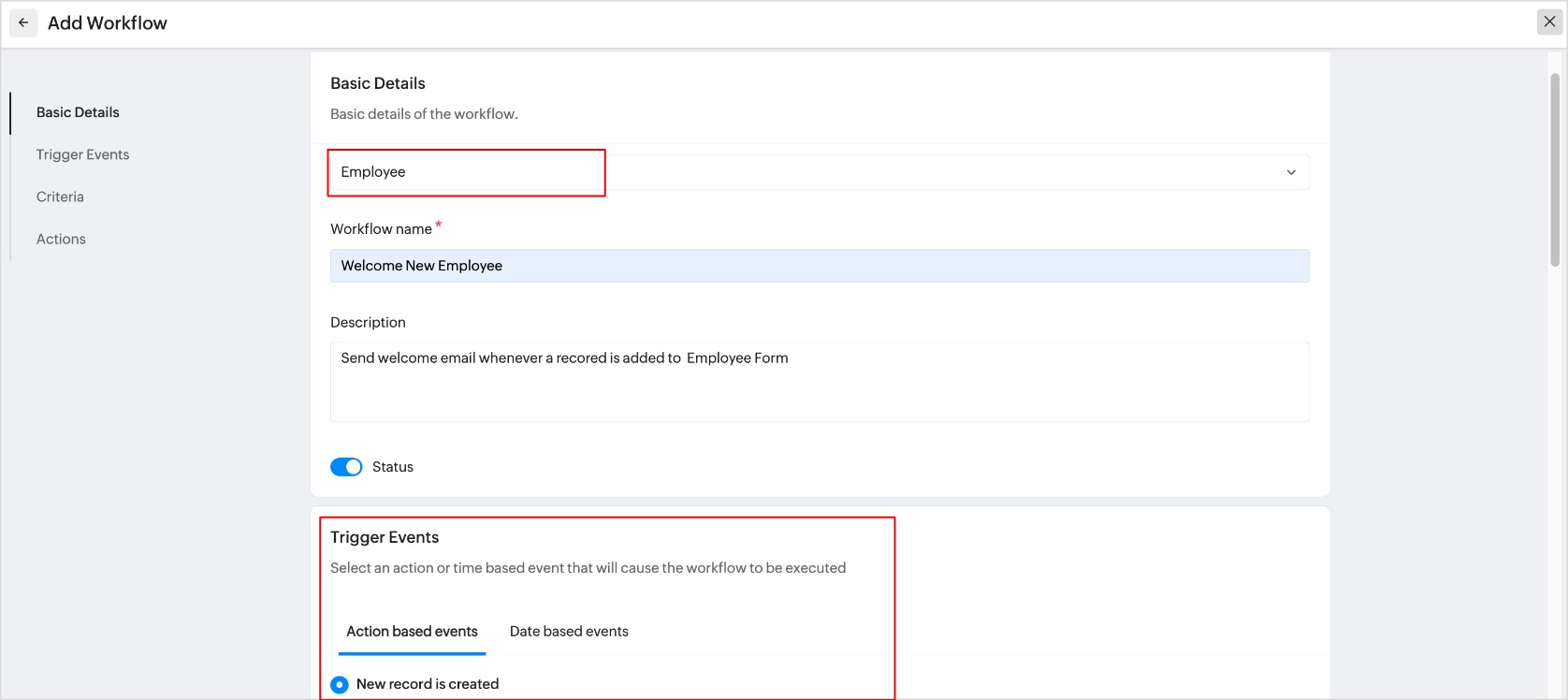 2. 必要な詳細をすべて提供し、ワークフロートリガーを定義します。ワークフローの設定については詳細はこちらをご覧ください。