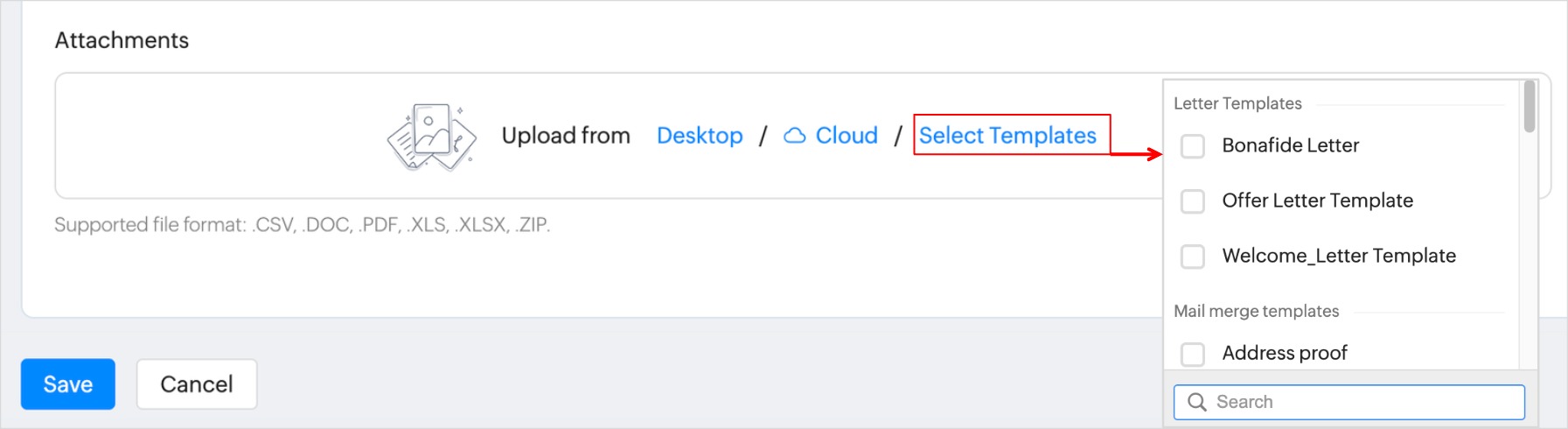 添付ファイルはデスクトップ, Cloud Picker (Google Drive, Dropbox, Onedrive, 箱, Evernoteからアップロードできます。また、フォームに既に作成されているレターテンプレートメールマージテンプレートをメール添付として使用することもできます。