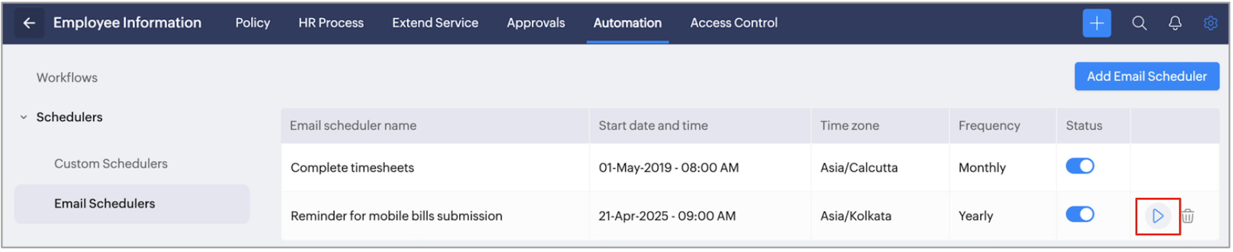 メール スケジュール処理が設定された後、それは次の詳細と共に設定 > 従業員情報 > 自動化 > スケジューラー > メールスケジューラーで見ることができます。