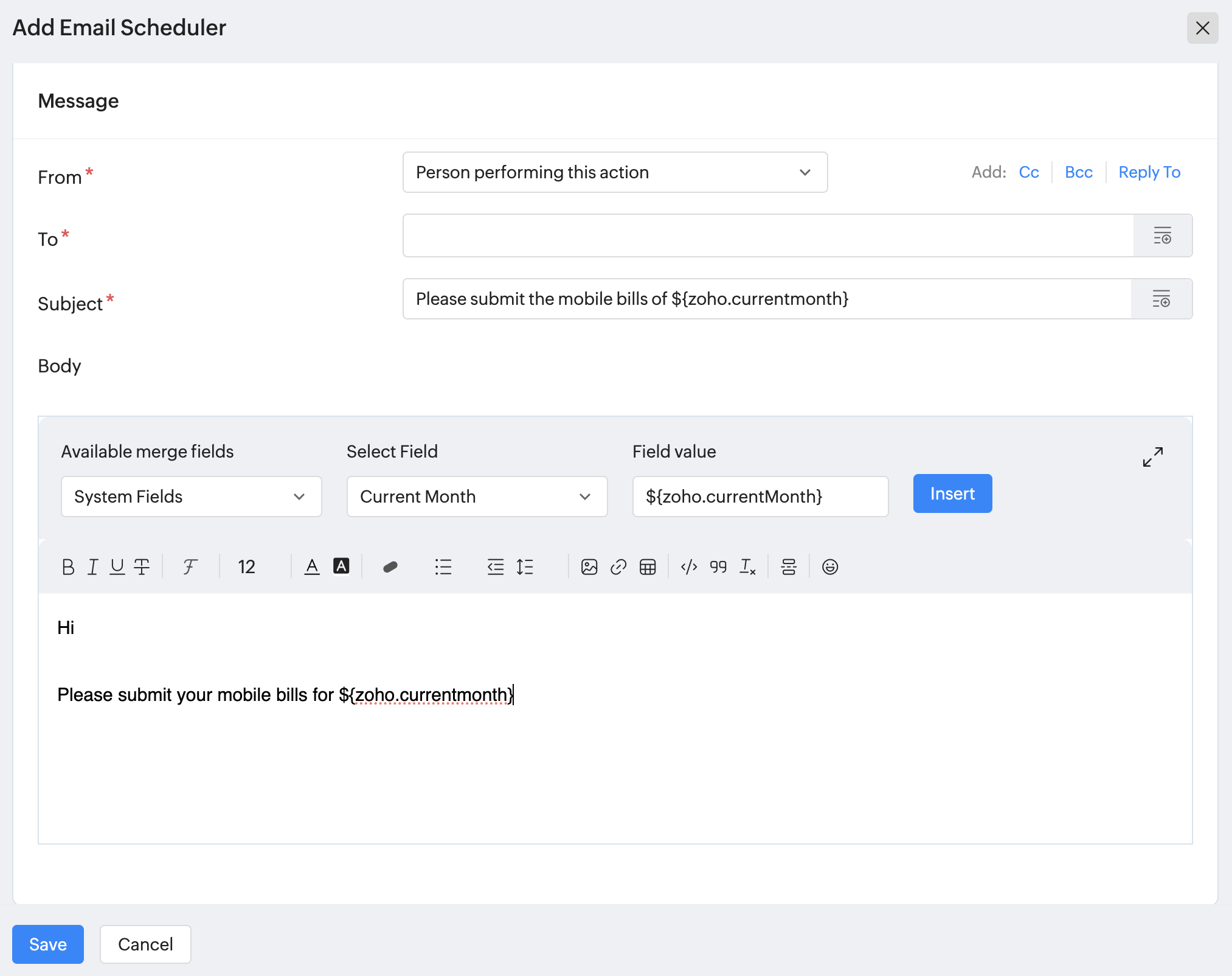 この場合、${Zoho.currentmonth}は、下の画像で示すように、Insert and Mergeアイテムを利用してメッセージに挿入されます。