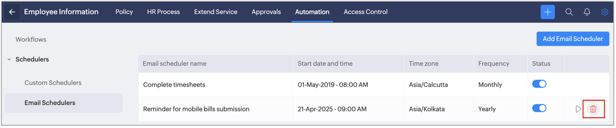 3. メール スケジュール処理を削除するには、ロウの右端に位置する削除アイコンをクリックします。