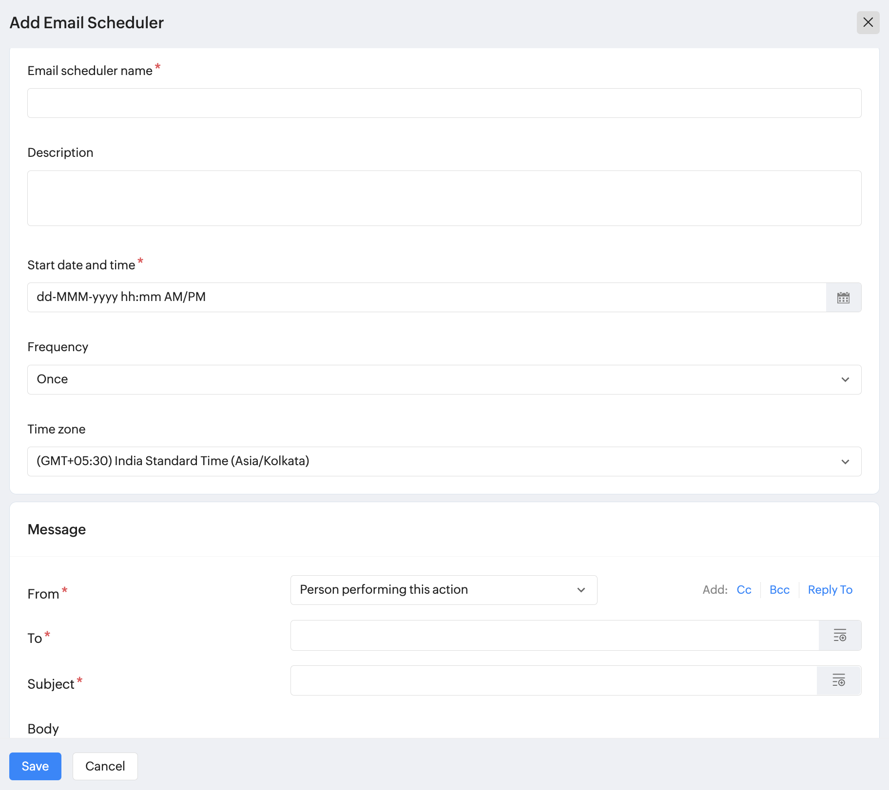 リストアイコンから設定を利用して件名を動的にすることができます。例えば、今月、現在の日付など。例えば、件名を'${Zoho.currentMonth}のモバイル受取請求書を送信してください'と設定し、システム項目から今月を選択すると、件名は毎月更新され、その月の名前が表示されます。