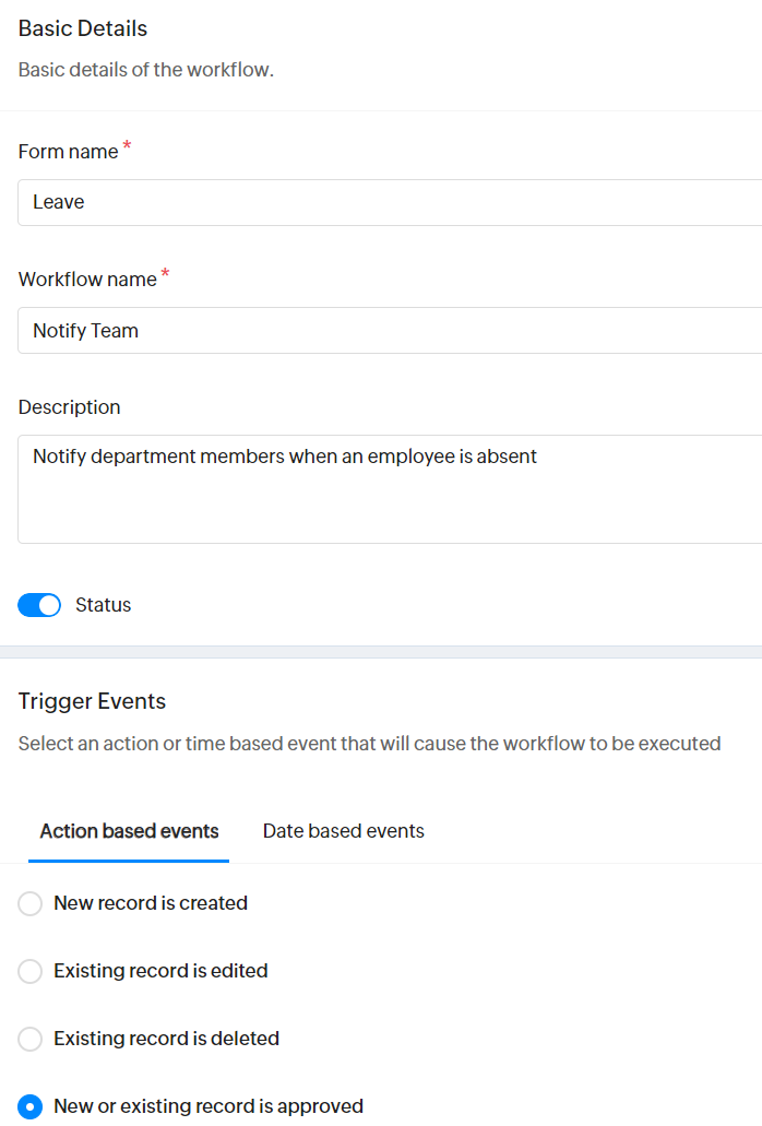 2. 基本情報を入力します。[Action Based Events](操作に応じて実行)内のラジオボタンを使用して、New or existing record is approved](新規または既存のデータが更新されたとき)を選択します。