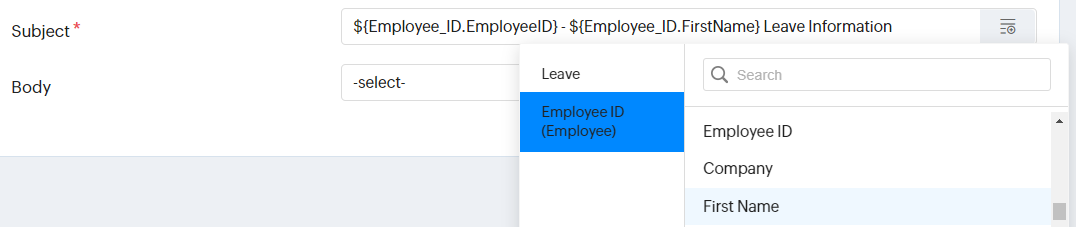 5. メール通知の本文は、独自のテキストを挿入し、[利用可能な差し込み項目]/[項目を選択する]を使用して作成されます。使用される最終的なテキストは、以下のとおりです。