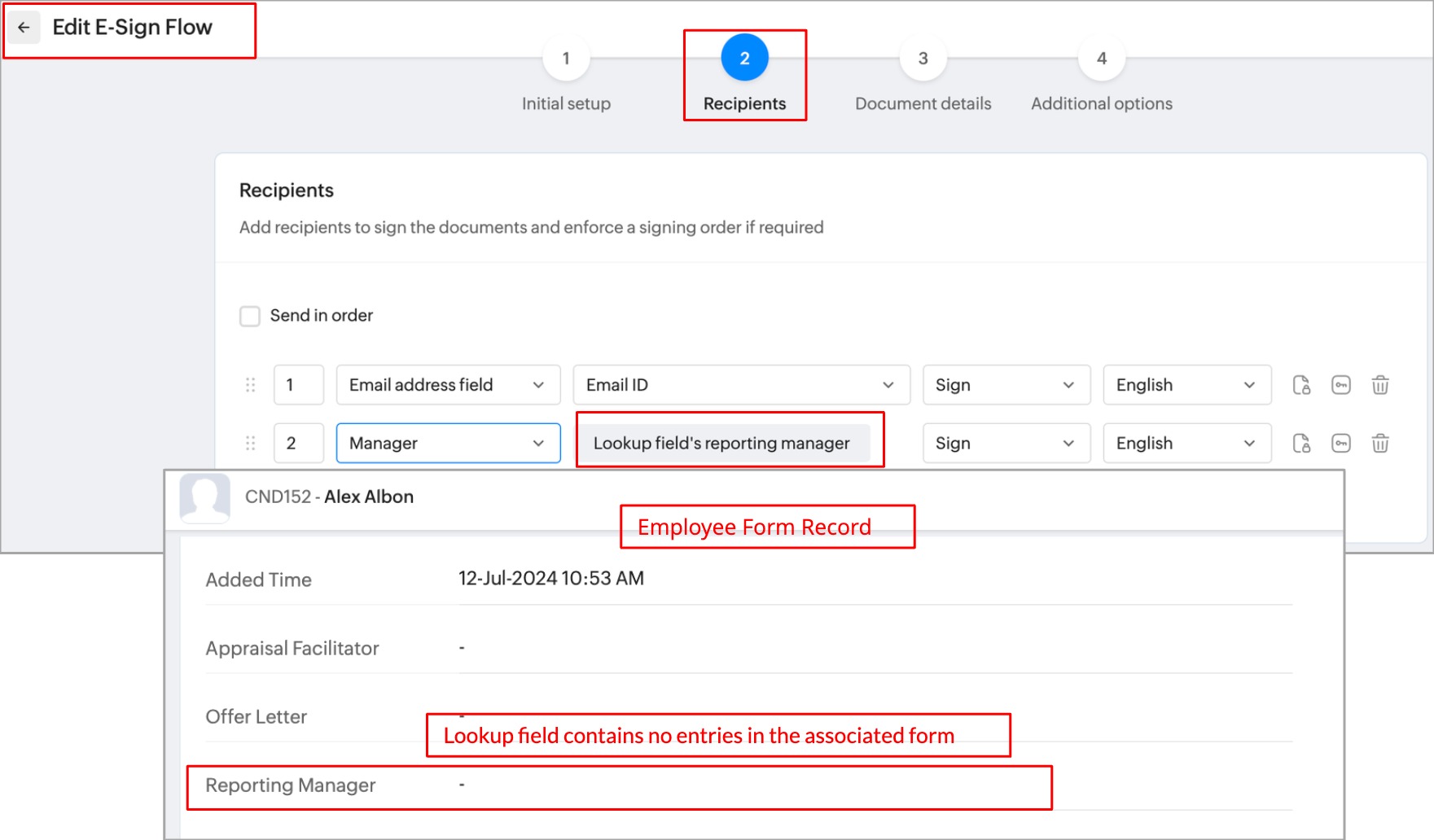 3. 電子署名フローの受信者に対して、ワークフローの処理が実行される関連フォーム内で十分な項目数が設定されていることを確認します。たとえば、メールアドレス上司がフォームの項目として選択され、関連フォームでその値が空白である場合、電子署名の処理は実行されません。