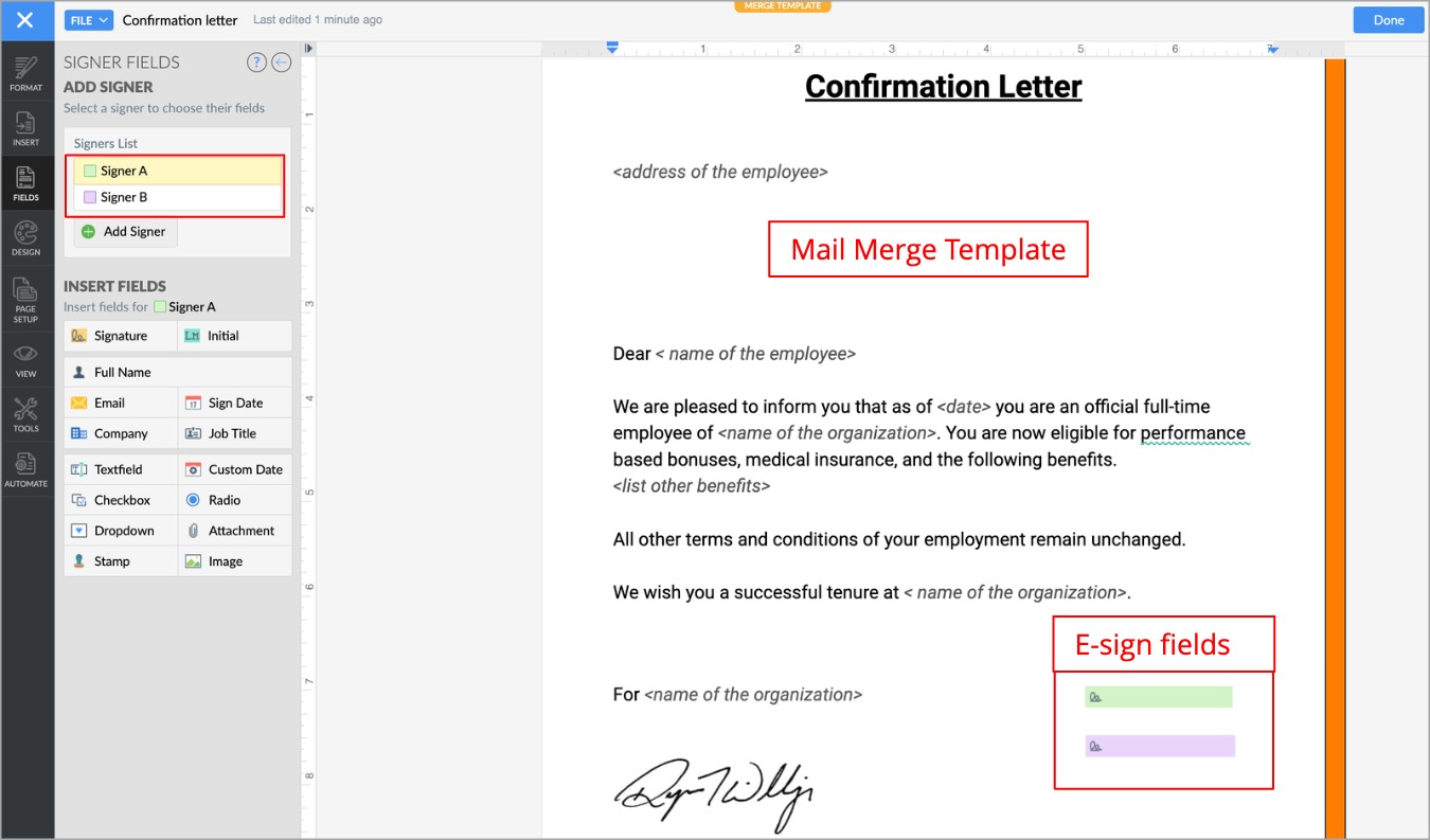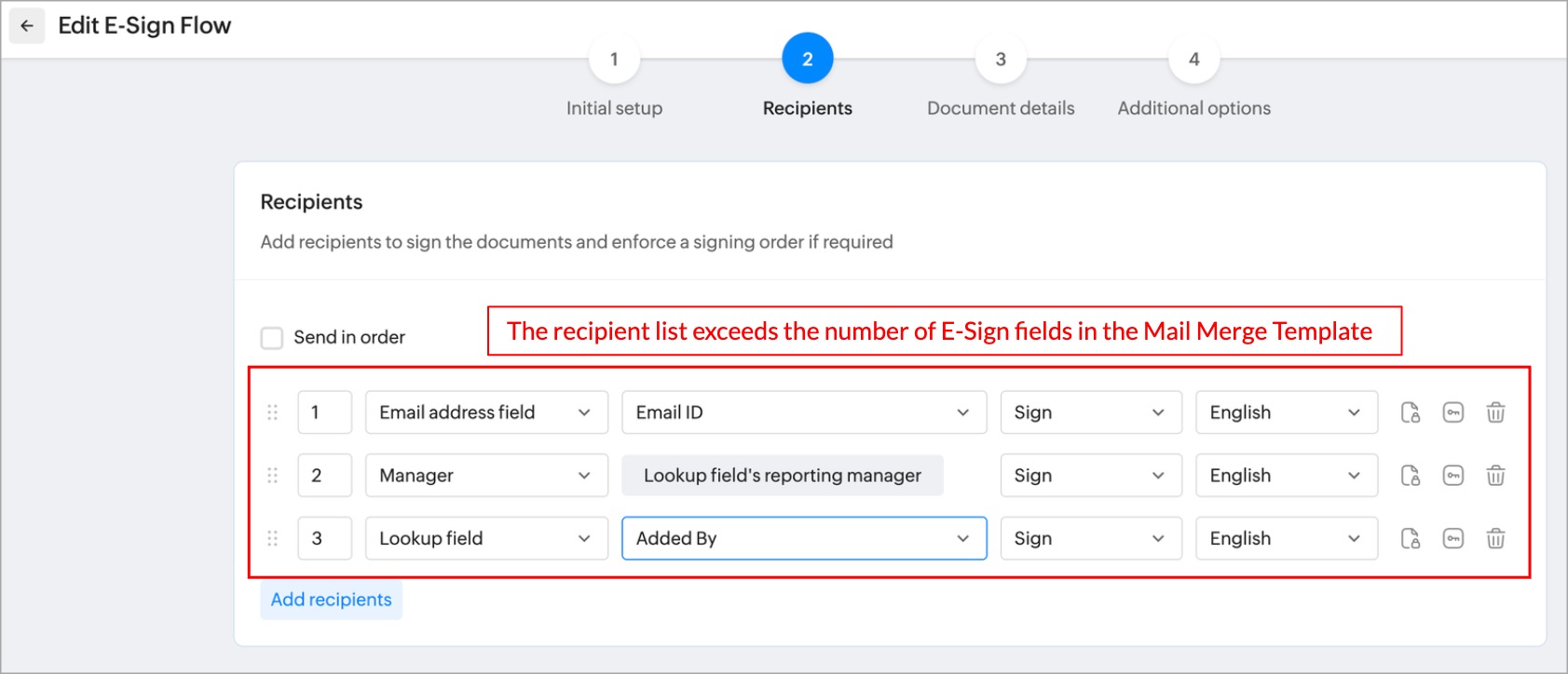 2. 電子署名フローの受信者に対して、差し込み文書テンプレートに十分な署名の項目数が追加されていることをご確認ください。受信者の数が差し込み文書テンプレートで設定された電子署名の項目数と一致しない場合、電子署名の処理は実行されません。