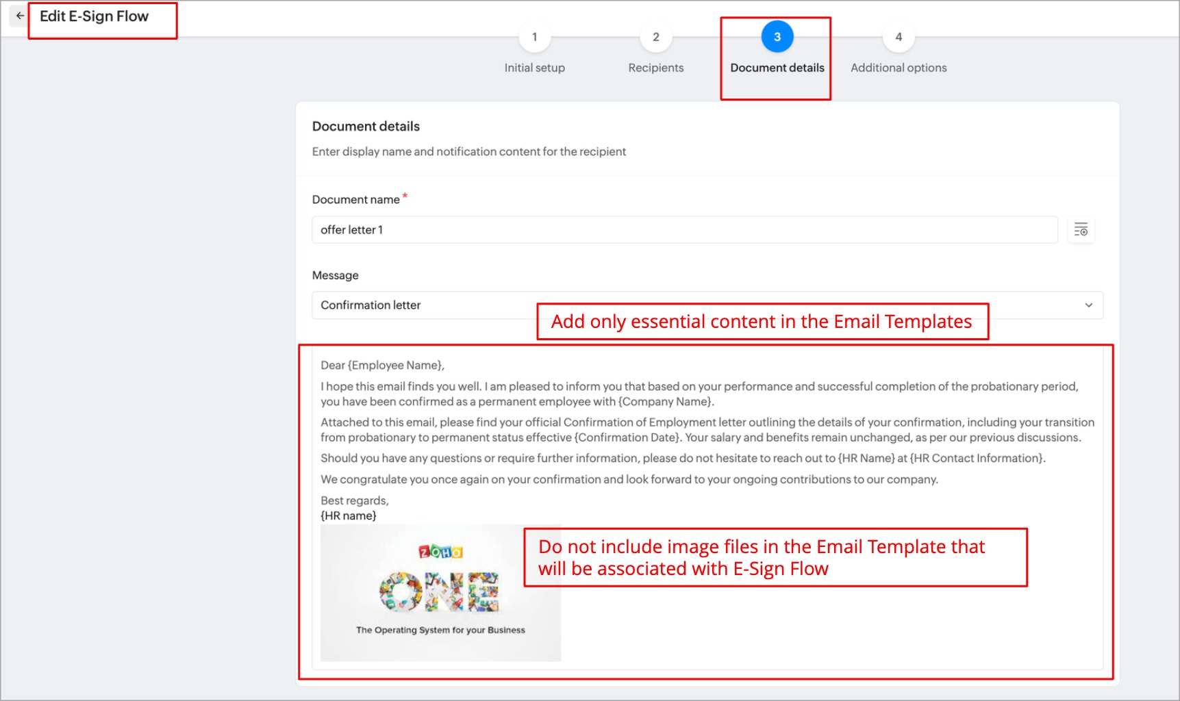 4. 電子署名フローの[文書の詳細]セクションでタグ付けされたメールテンプレートが最大文字数を超えていないこと、および画像ファイルを含まないことをご確認ください。制限文字数を超えた場合や画像ファイルが含まれている場合、電子署名の処理は実行されません。