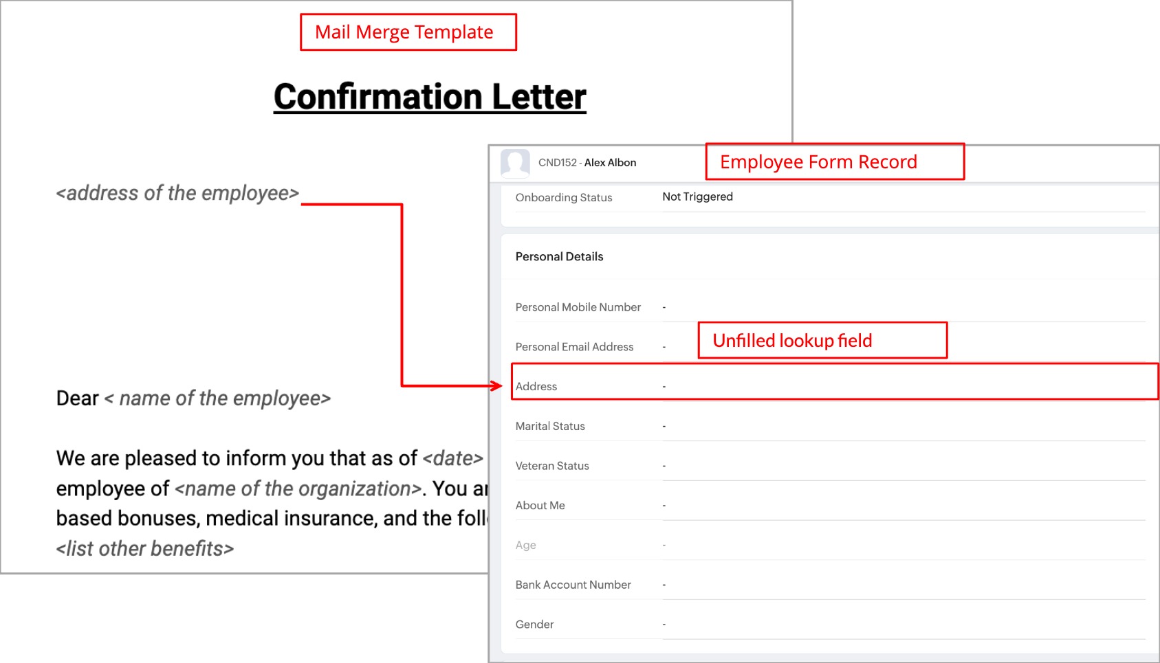 9. 差し込み文書テンプレートで設定されたすべてのフォームの項目が、処理が実行される関連フォームのデータ内で入力されていることをご確認ください。未入力の項目は、電子署名用に送信された差し込み文書でも空欄となります。
